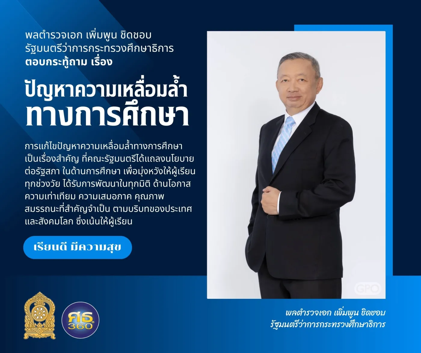 พลตำรวจเอก เพิ่มพูน ชิดชอบ รัฐมนตรีว่าการกระทรวงศึกษาธิการ ตอบกระทู้ถามของนายสฤษฏ์พงษ์ เกี่ยวข้อง สมาชิกสภาผู้แทนราษฎร พรรคภูมิใจไทย จังหวัดกระบี่ เรื่อง ปัญหาความเหลื่อมล้ำทางการศึกษา ในราชกิจจานุเบกษา (15 พฤษภาคม 2567)