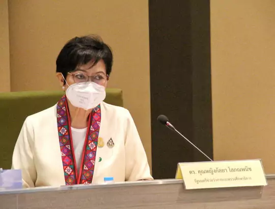 คุณหญิงกัลยา โสภณพนิช รมช.ศึกษาธิการ กล่าวว่าในนามของรัฐบาล เป็นรัฐมนตรีที่ได้ร่วมงานกับท่านทั้งหลาย ขอขอบคุณผู้บริหารหน่วยงานทั้ง 176 หน่วยงาน ที่ได้ให้ความร่วมมือกับรัฐบาลอย่างดียิ่ง โดยเฉพาะกระทรวงศึกษาธิการได้ตอบสนองต่อมาตรการต่าง ๆ จนทำให้ผลการปฏิบัติงานเป็นไปอย่างหน้าพอใจ มีผู้ติดเชื้อโควิด-19 ลดลงมาก จำนวนผู้ป่วยที่หายจากอาการป่วยมีจำนวนมากขึ้นเช่นกัน จนทำให้ทั่วโลกยกย่องมาตรการและวิธีปฏิบัติของประเทศไทย ว่าเป็นแบบอย่างที่ดีของโลกในขณะนี้