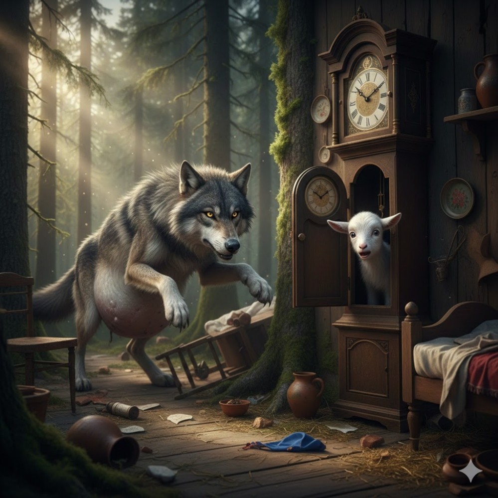 เมื่อประตูเปิดออก หมาป่าก็จู่โจมอย่างรวดเร็ว ลูกแพะที่ตื่นตระหนกต่างพากันวิ่งหนีไปซ่อนตามที่ต่างๆ ทั่วบ้าน แต่หมาป่าที่มีสัญชาตญาณนักล่าก็หาพวกเขาเจอเกือบทุกคน หมาป่ากลืนลูกแพะลงท้องไปทีละตัวอย่างโหดร้าย ยกเว้นเพียงลูกแพะตัวที่เล็กที่สุด ซึ่งซ่อนตัวอยู่ใน “นาฬิกาตั้งพื้น” อย่างนิ่งเงียบและมีสติที่สุด เขาเป็นคนเดียวที่ยังยึดมั่นในคำสั่งของแม่จนวินาทีสุดท้าย