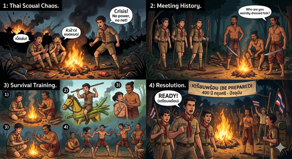 ลูกเสือเก่ง: “ผมเข้าใจแล้วครับพี่เอก ถึงไม่มีเน็ต ไม่มีไอโฟน ถ้าเรามีทักษะชีวิต แบบชาวกรุงศรีอยุธยาเมื่อ 400 ปีก่อนเราก็อยู่รอดได้!”