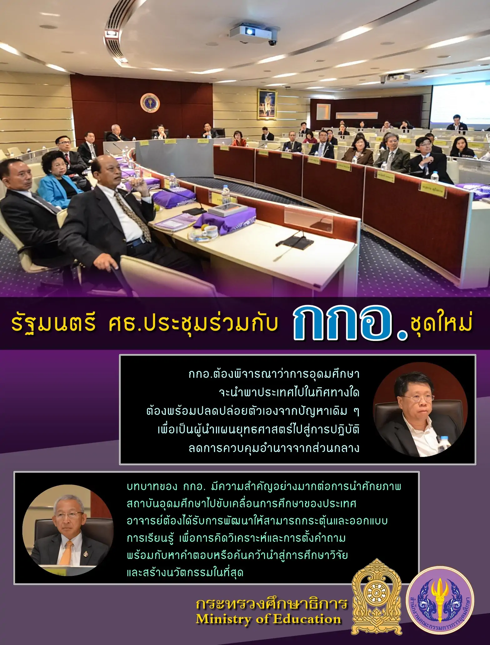 นพ.ธีระเกียรติ เจริญเศรษฐศิลป์ รัฐมนตรีว่าการกระทรวงศึกษาธิการ ประชุมร่วมกับคณะกรรมการการอุดมศึกษาชุดใหม่ โดยมีศาสตราจารย์คลินิก นพ.อุดม คชินทร รัฐมนตรีช่วยว่าการกระทรวงศึกษาธิการ, รศ.นพ.โศภณ นภาธร ผู้ช่วยรัฐมนตรีประจำกระทรวงศึกษาธิการ, ศาสตราจารย์ สัมพันธ์ ฤทธิเดช (ว่าที่เลขาธิการคณะกรรมการการอุดมศึกษาคนใหม่), นางอรสา ภาววิมล รองเลขาธิการคณะกรรมการการอุดมศึกษา และผู้บริหารกระทรวงศึกษาธิการ เข้าร่วมประชุม เมื่อวันพุธที่ 13 กุมภาพันธ์ 2562 ณ สำนักงานคณะกรรมการการอุดมศึกษา