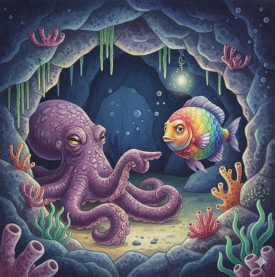 ปลาสายรุ้งจึงไปขอคำแนะนำจากปลาหมึกยักษ์ผู้ฉลาดรอบรุ้