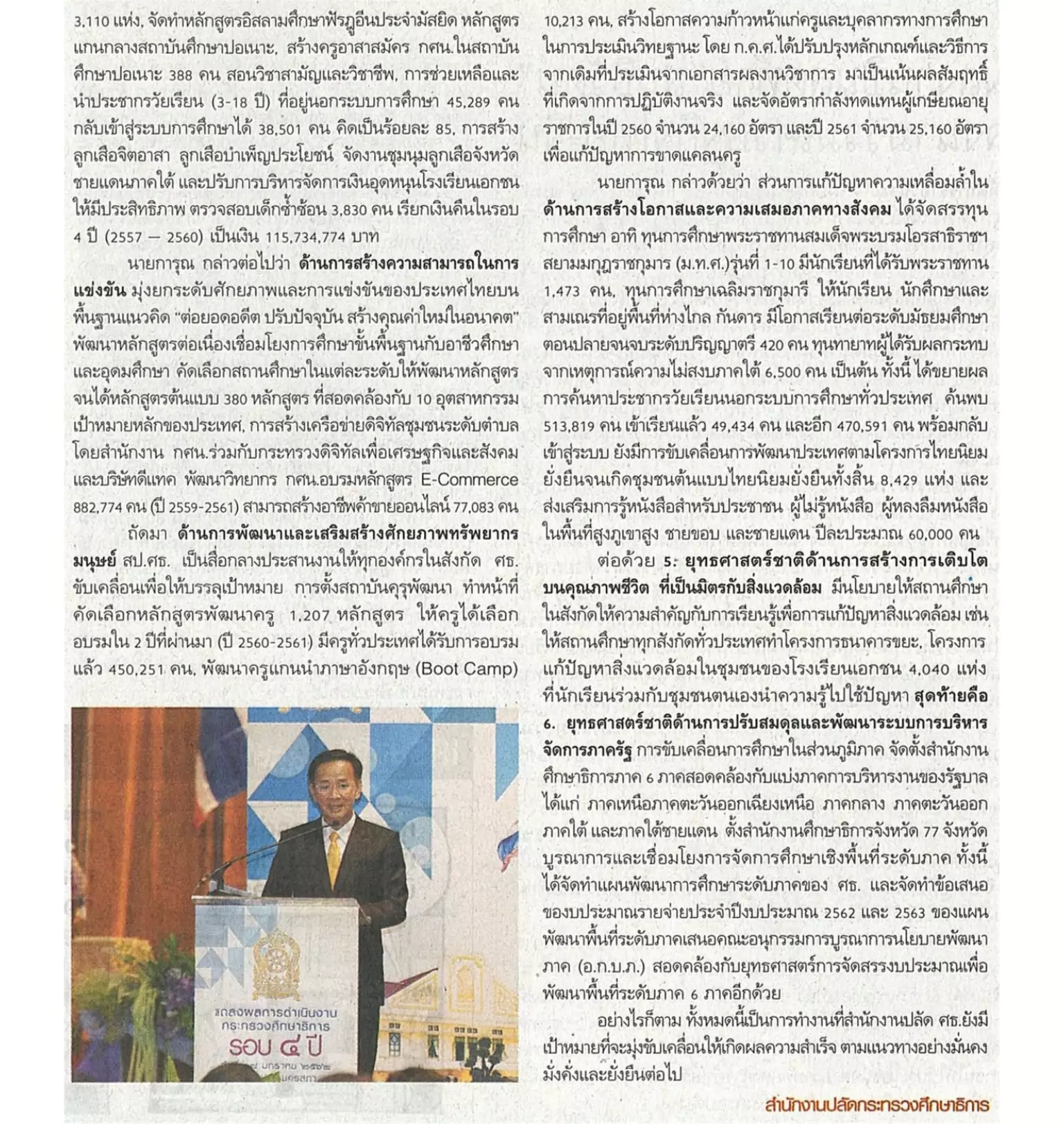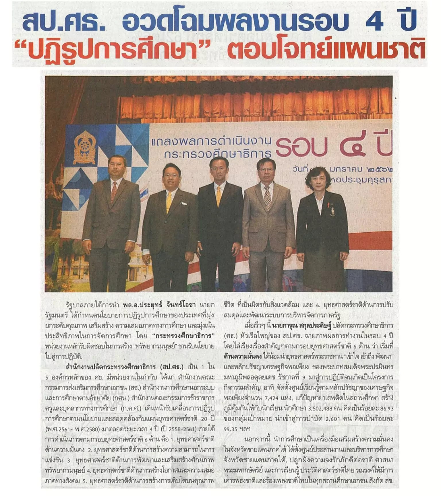 กระทรวงศึกษาธิการ โดยสำนักงานปลัดกระทรวงศึกษาธิการ เผยแพร่บทความ “สป.ศธ.อวดโฉมผลงานรอบ 4 ปี “ปฏิรูปการศึกษา” ตอบโจทย์แผนชาติ” ในหนังสือพิมพ์ ASTVmanager ฉบับวันที่ 1 กุมภาพันธ์ 2562