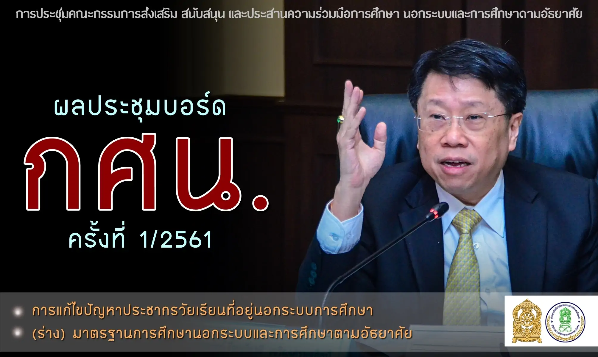 นพ.ธีระเกียรติ เจริญเศรษฐศิลป์ รัฐมนตรีว่าการกระทรวงศึกษาธิการ เป็นประธานการประชุมคณะกรรมการส่งเสริม สนับสนุน และประสานความร่วมมือการศึกษานอกระบบและการศึกษาตามอัธยาศัย ครั้งที่ 1/2561 เมื่อวันพฤหัสบดีที่ 15 พฤศจิกายน 2561 ณ ห้องประชุมราชวัลลภ