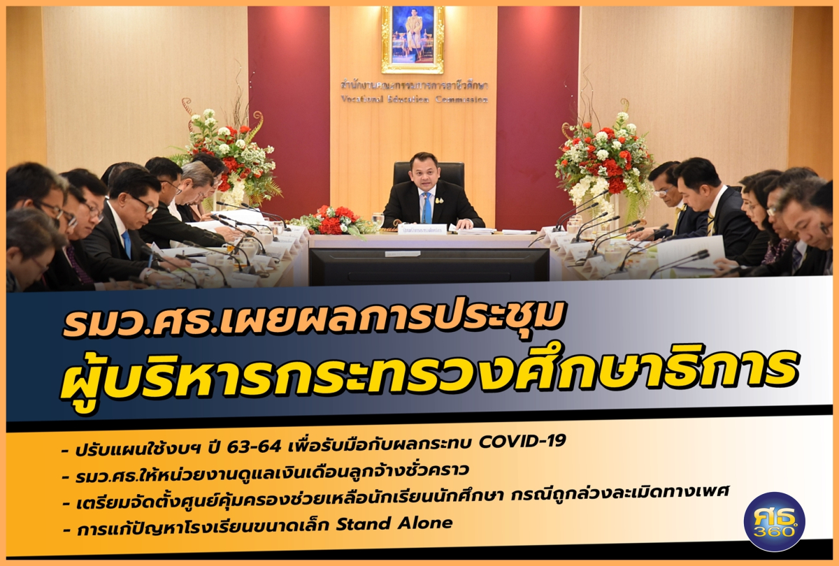 รมว.ศึกษาธิการ เปิดเผยภายหลังการประชุมว่า ที่ประชุมได้หารือถึงแนวทางการขับเคลื่อนการทำงานของ ศธ. เพื่อให้มีแนวทางตรงกัน โดยได้มอบหมายให้ทุกหน่วยงานกลับไปพิจารณาปรับแผนการใช้งบประมาณปี 2563 และงบประมาณปี 2564 เนื่องจากต้องมีการวางแผนสำรองในการรับมือกับผลกระทบที่เกิดจากสถานการณ์ไวรัสโคโรนาสายพันธุ์ใหม่ (COVID-19) ซึ่งอาจจะส่งผลให้เศรษฐกิจที่อาจจะเกิดการชะลอตัว เพื่อไม่ให้เกิดความเสียหายกับบุคลากรทางการศึกษา และการเรียนการสอน ซึ่งสามารถใช้วิกฤตนี้เป็นโอกาสได้ด้วยการนำงบประมาณส่วนหนึ่งมาใช้ในการพัฒนาอย่างเข้มข้น ไม่ใช่เป็นเพียงการอบรมสัมมนา แต่จะเป็นการบูรณาการการอบรมกับมหาวิทยาลัยต่าง ๆ ผ่านการเรียนรู้ด้วย Digital Learning Platform ให้มากขึ้น