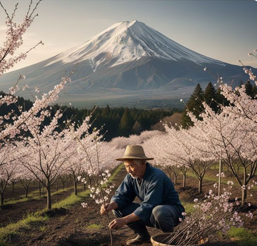 ทุกเช้า คุณตาจะแบกจอบกับถังน้ำ   เดินขึ้นภูเขาช้าๆ  ขุดดินแข็งๆ และปลูกต้นซากุระทีละต้น    แม้จะเหนื่อย แต่คุณตาก็ไม่ยอมแพ้     บางวันฝนตกหนัก  ต้นกล้าเล็กๆ ก็ล้มลง   บางวันแดดร้อนจัด ต้นไม้ก็แห้งตาย