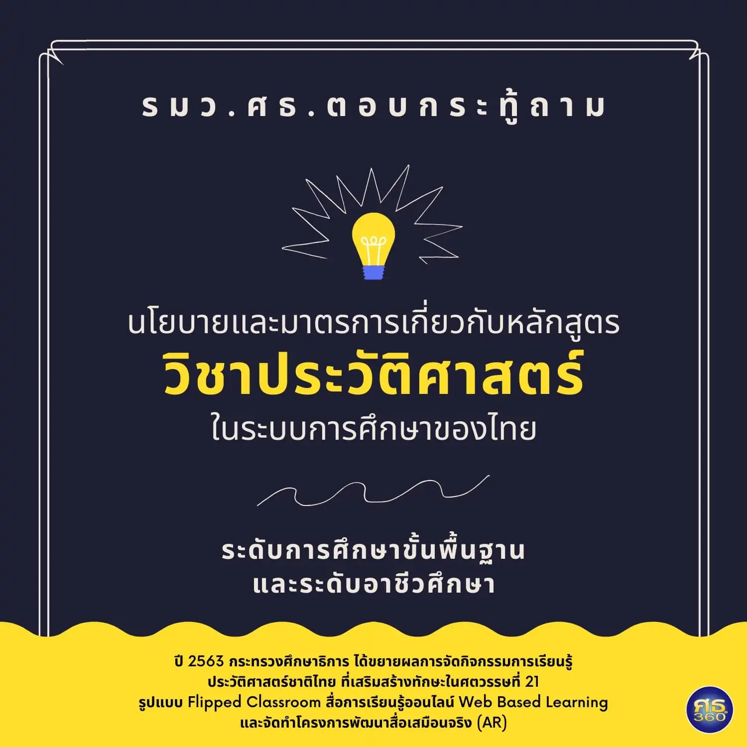 กระทรวงศึกษาธิการขอเรียนว่า ได้ตระหนักถึงความสำคัญในการศึกษาประวัติศาสตร์ จึงได้มีการบรรจุหลักสูตรการเรียนการสอนวิชาประวัติศาสตร์มาอย่างต่อเนื่อง ทั้งในระดับการศึกษาขั้นพื้นฐาน และระดับอาชีวศึกษา