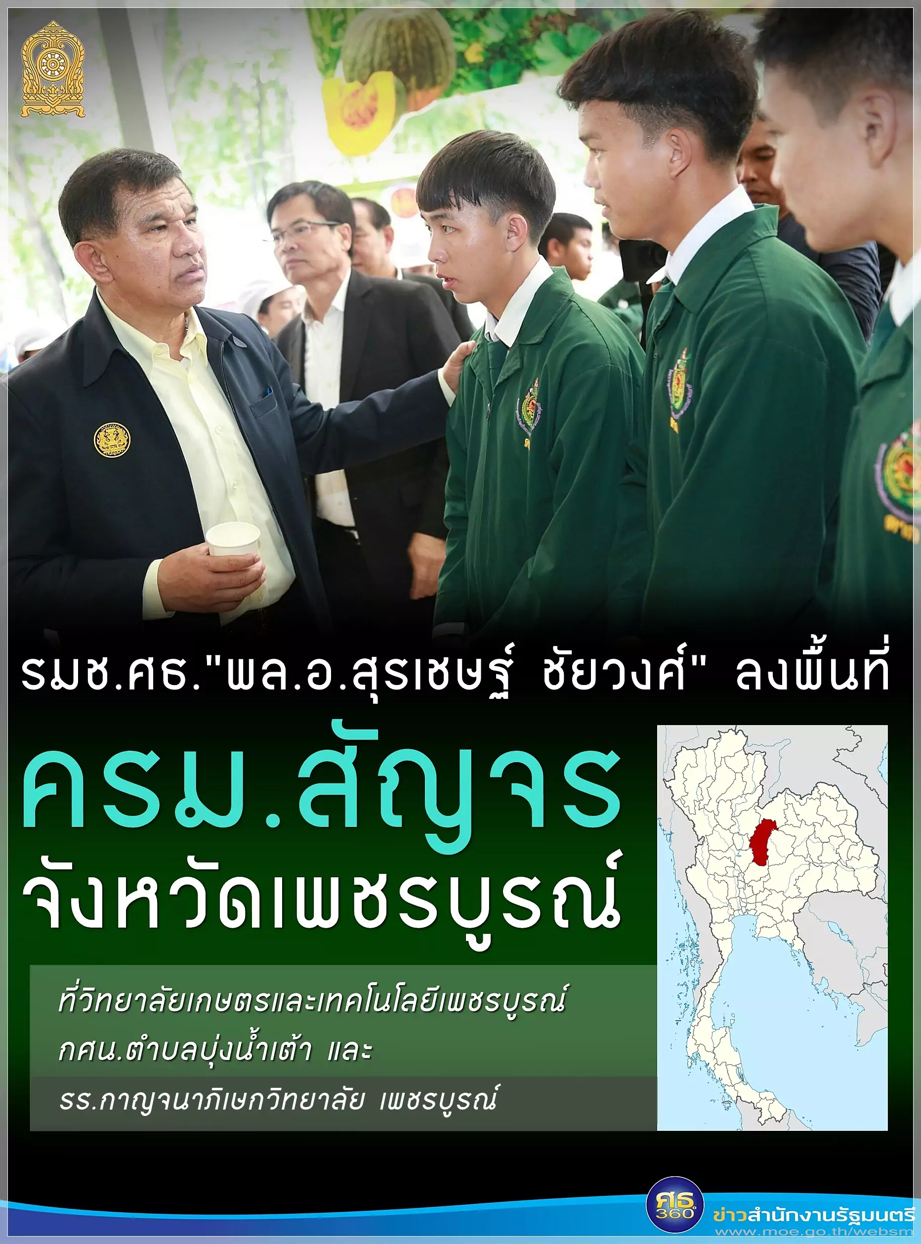 พล.อ.สุรเชษฐ์ ชัยวงศ์ รัฐมนตรีช่วยว่าการกระทรวงศึกษาธิการ ลงพื้นที่ติดตามผลการดำเนินงานตามโครงการ/นโยบายสำคัญของรัฐบาลและกระทรวงศึกษาธิการ ด้านการผลิตและพัฒนากำลังคนอาชีวศึกษาและการจัดการเรียนการสอนตามโครงการอาชีวศึกษาเพื่อการพัฒนาชนบท (อศ.กช.) ที่วิทยาลัยเกษตรและเทคโนโลยีเพชรบูรณ์ ติดตามผลการดำเนินงานของสำนักงาน กศน.ตำบล