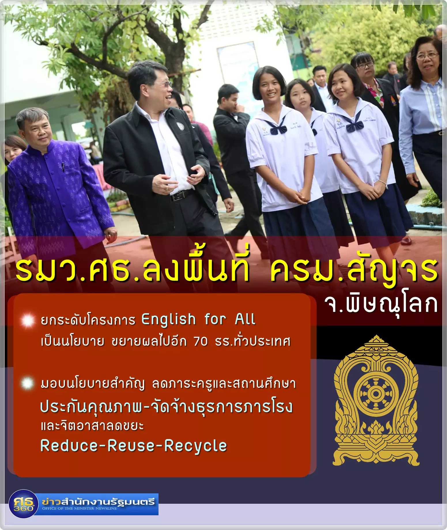 รมว.ศึกษาธิการ กล่าวว่า การตรวจเยี่ยมโรงเรียนแห่งนี้ เพื่อติดตามผลการดำเนินงานโครงการ English for All ซึ่งเป็นโครงการที่ดีสำหรับการสอนภาษาอังกฤษให้กับเด็กในครอบครัวที่มีฐานะยากจน ให้ได้มีโอกาสพัฒนาภาษาอังกฤษเช่นเดียวกับเด็กในเมือง ถือเป็นการดำเนินงานตามยุทธศาสตร์ชาติในเรื่องของการลดความเหลื่อมล้ำทางการศึกษา ซึ่งต่อเนื่องจากการตรวจเยี่ยมโรงเรียนแห่งนี้เมื่อช่วงเดือนมกราคมที่ผ่านมา