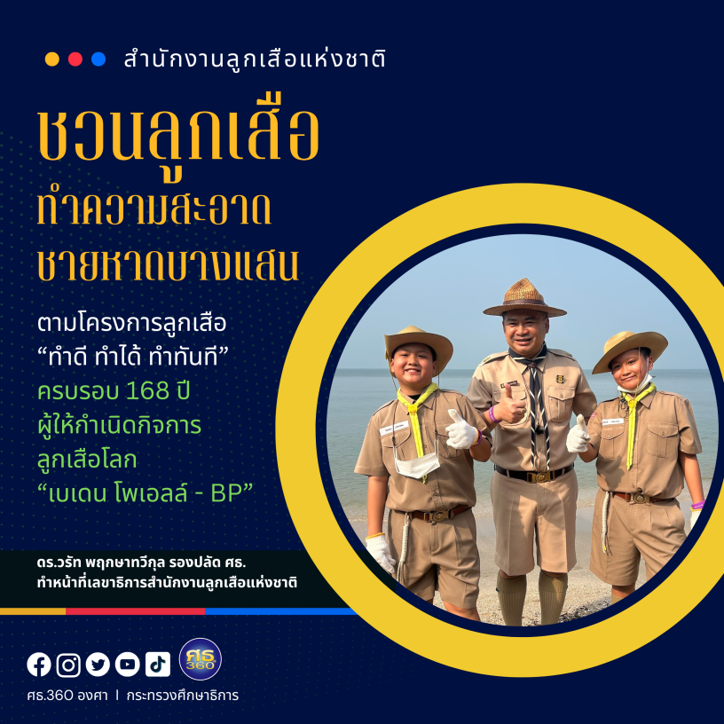 จังหวัดชลบุรี, 22 กุมภาพันธ์ 2568 – ดร.วรัท พฤกษาทวีกุล รองปลัดกระทรวงศึกษาธิการ ทำหน้าที่เลขาธิการสำนักงานลูกเสือแห่งชาติ ร่วมกิจกรรมโครงการลูกเสือ “ทำดี ทำได้ ทำทันที” ทำความสะอาดชายหาดบางแสน ณ บริเวณชายหาดบางแสน อำเภอเมืองชลบุรี