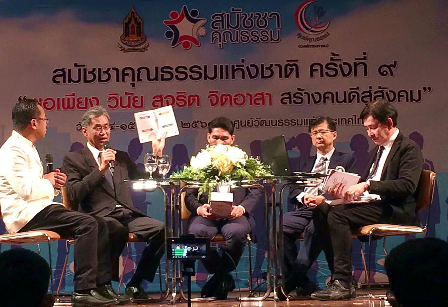 ผู้เข้าร่วมเสวนาเวทีนี้ คือ นายพีระ รัตนวิจิตร รองปลัดกระทรวงศึกษาธิการ พูดในประเด็นสถานศึกษาคุณธรรม, นายจำเริญ โพธิยอด ผู้ตรวจราชการกระทรวงการคลัง พูดในประเด็นกระทรวง (ส่งเสริม) คุณธรรม, ศาสตราจารย์พิเศษ นพ.สวรรค์ ขวัญใจพาณิช ผู้อำนวยการโรงพยาบาลชลบุรี พูดถึงประเด็นโรงพยาบาลคุณธรรม และนายพัฒนชัย กุลสิริสวัสดิ์ กรรมการต่อต้านคอร์รัปชั่นและส่งเสริมจรรยาบรรณ หอการค้าไทย พูดถึงประเด็นการส่งเสริมธุรกิจคุณธรรม โดยนายสิน สื่อสวน ผู้อำนวยการศูนย์คุณธรรม (องค์การมหาชน) เป็นผู้ดำเนินรายการ