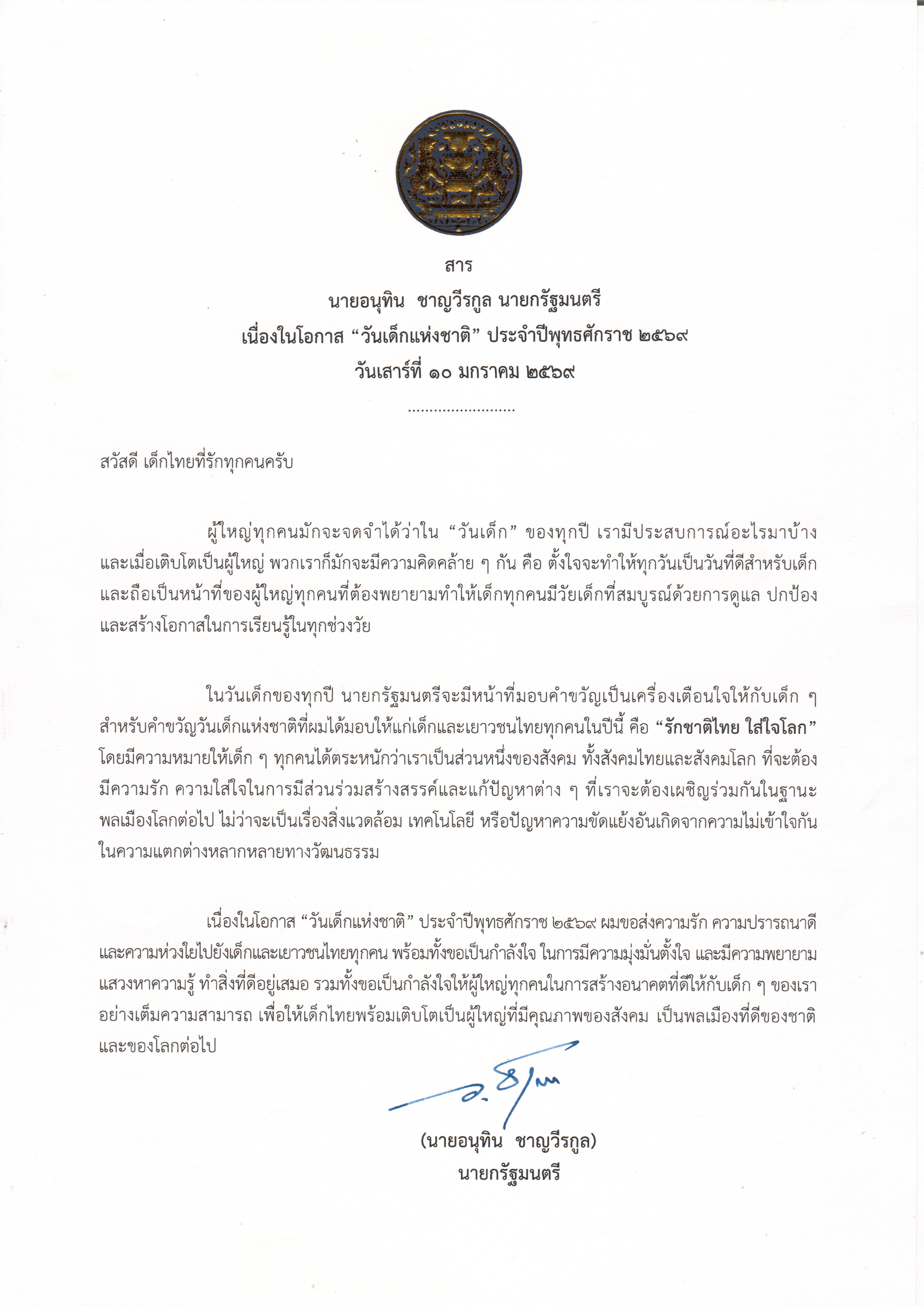 เนื่องในวันเสาร์ที่ 10 มกราคม พ.ศ. 2569 ซึ่งตรงกับวันเด็กแห่งชาติ นายอนุทิน ชาญวีรกูล นายกรัฐมนตรี ได้ส่งสารเพื่อแสดงความปรารถนาดีและมอบความห่วงใยไปยังเด็กและเยาวชนไทยทุกคน