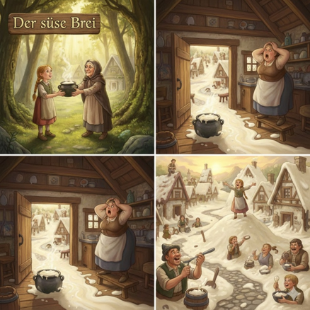 วันหนึ่งขณะที่เด็กหญิงออกไปข้างนอก แม่ของเธอเกิดหิวขึ้นมาจึงสั่งให้หม้อทำงาน:“หม้อวิเศษจ๋า ต้มข้าวเถอะ!” ข้าวต้มร้อนๆ รสอร่อยก็ปรุงขึ้นมาจนเต็มหม้อ แม่กินจนอิ่มหนำสำราญ แต่… แม่ จำคำสั่งให้หยุดต้มข้าวไม่ได้!