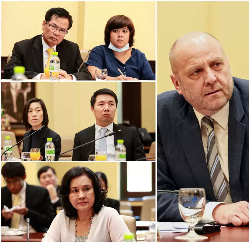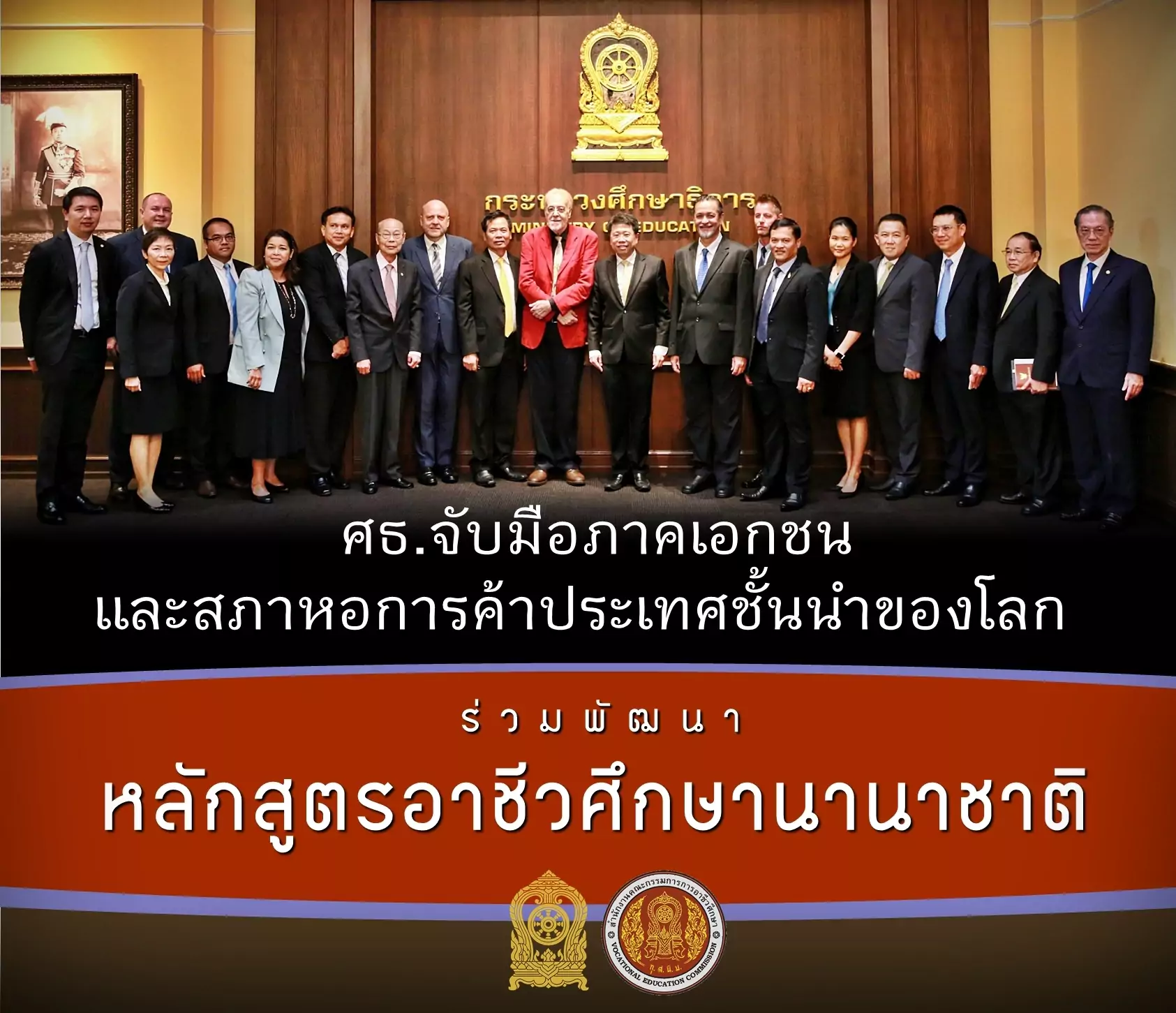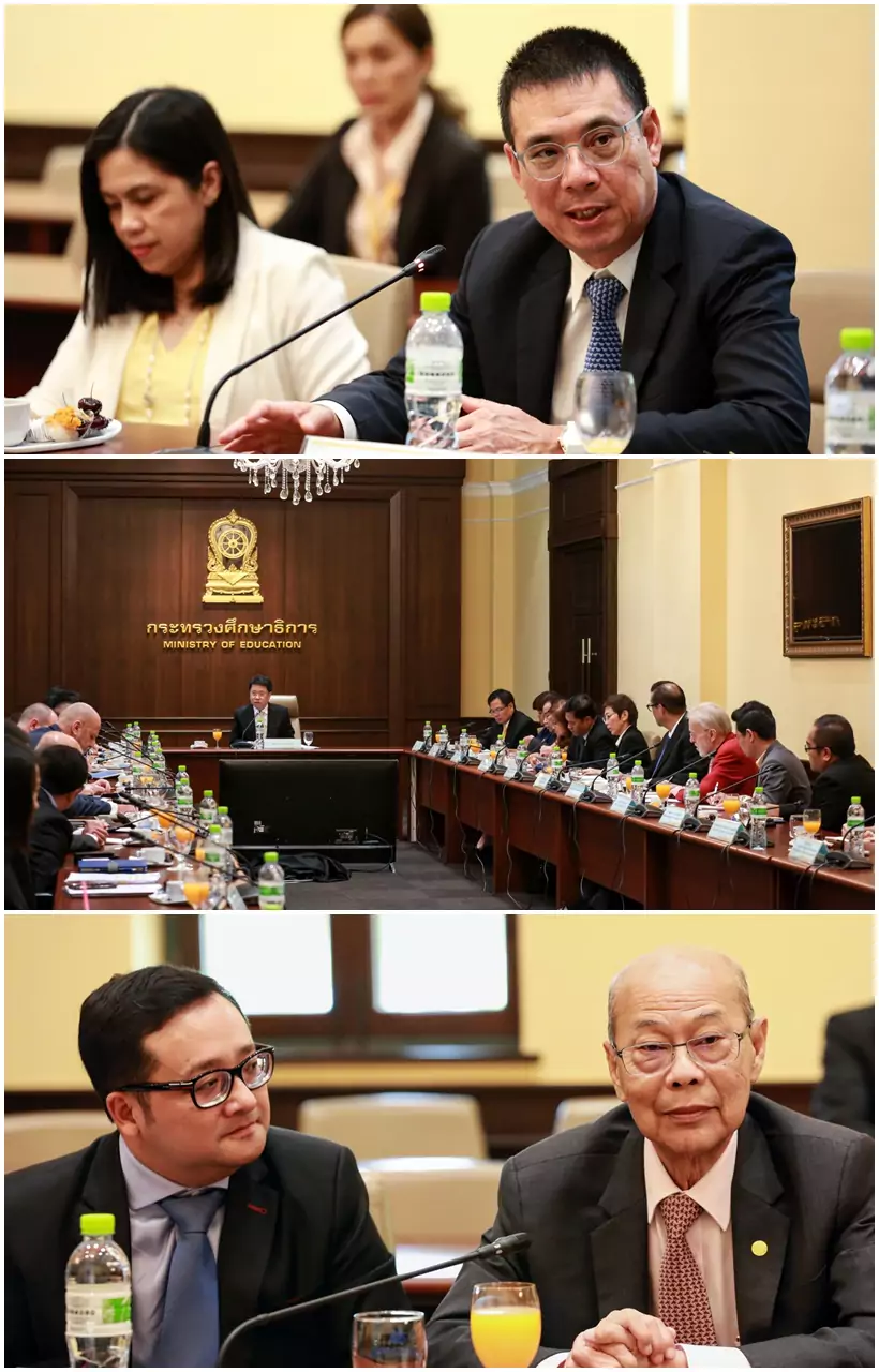 “การประชุมครั้งนี้มีผู้บริหารกระทรวงศึกษาธิการ คือ ม.ล.ปริยดา ดิศกุล เลขานุการรัฐมนตรีว่าการกระทรวงศึกษาธิการ, นายสุเทพ ชิตยวงษ์ เลขาธิการคณะกรรมการการอาชีวศึกษา เข้าร่วมประชุมหารือร่วมกับ ประธานและผู้แทนสภาหอการค้าของต่างประเทศในประเทศไทย คือ เยอรมนี, ออสเตรเลีย, จีน, สหรัฐอเมริกา, สหราชอาณาจักร, เกาหลีใต้ ตลอดจนผู้แทนภาคเอกชน ภาคอุตสาหกรรม และภาคธุรกิจชั้นนำ อาทิ นายรุ่งโรจน์ รังสิโยภาส กรรมการผู้จัดการใหญ่ บริษัท ปูนซิเมนต์ไทย จำกัด (มหาชน) หรือ SCG, รศ.ดร.จีรเดช อู่สวัสดิ์ กรรมการกลุ่มมิตรผล, น.ส.ศิริพร พัชรวัฒน์ ผู้อำนวยการด้านนวัตกรรมการศึกษา บริษัท ไมโครซอฟท์ (ประเทศไทย) จำกัด, Dr Hua Xie CEO, TCC BUSINESS CENTER เป็นต้น”