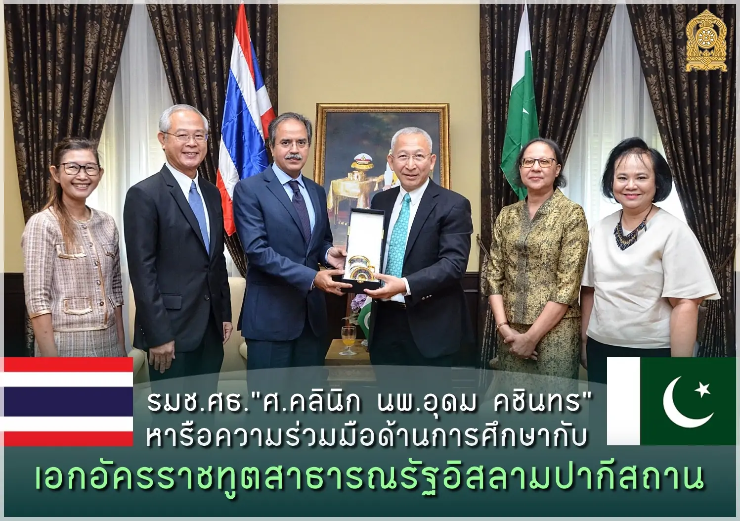 ศาสตราจารย์คลินิก นพ.อุดม คชินทร รัฐมนตรีช่วยว่าการกระทรวงศึกษาธิการ พร้อมด้วย รศ.นพ.ปรีชา สุนทรานันท์ ผู้ช่วยเลขานุการรัฐมนตรีว่าการกระทรวงศึกษาธิการ ให้การต้อนรับและหารือกับ H.E. Mr. Asim Iftikhar Ahmad เอกอัครราชทูตสาธารณรัฐอิสลามปากีสถานประจำประเทศไทย โดยมีนางสาวดุริยา อมตวิวัฒน์ ผู้ตรวจราชการกระทรวงศึกษาธิการ ตลอดจนผู้แทนจากสำนักงานคณะกรรมการการอุดมศึกษา (สกอ.) และสำนักความสัมพันธ์ต่างประเทศ สป. ร่วมหารือ เมื่อวันจันทร์ที่ 7 มกราคม 2562 ณ ห้องดำรงราชานุภาพ กระทรวงศึกษาธิการ