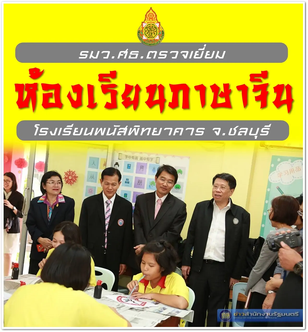นพ.ธีระเกียรติ เจริญเศรษฐศิลป์ รัฐมนตรีว่าการกระทรวงศึกษาธิการ ลงพื้นที่จังหวัดชลบุรี เมื่อวันอังคารที่ 27 พฤศจิกายน 2561 เพื่อตรวจเยี่ยมโครงการห้องเรียนภาษาจีน โรงเรียนพนัสพิทยาคาร อำเภอพนัสนิคม โดยมีนายบุญรักษ์ ยอดเพชร เลขาธิการคณะกรรมการการศึกษาขั้นพื้นฐาน, ศาสตราจารย์พิเศษ ประพิณ มโนมัยวิบูลย์ คณะทำงานด้านยุทธศาสตร์การพัฒนาการเรียนการสอนภาษาจีน, ผู้ช่วยศาสตราจารย์ ปราณี โชคขจิตสัมพันธ์ ผู้เชี่ยวชาญพิเศษด้านหลักสูตรการศึกษา ปฏิบัติหน้าที่ที่ปรึกษาพิเศษสถาบันภาษาจีน, รองศาสตราจารย์ ดร.สฎายุ ธีระวณิชตระกูล คณบดีคณะศึกษาศาสตร์ มหาวิทยาลัยบูรพา และคณะผู้บริหารสำนักงานคณะกรรมการการศึกษาขั้นพื้นฐาน (สพฐ.) ร่วมลงพื้นที่