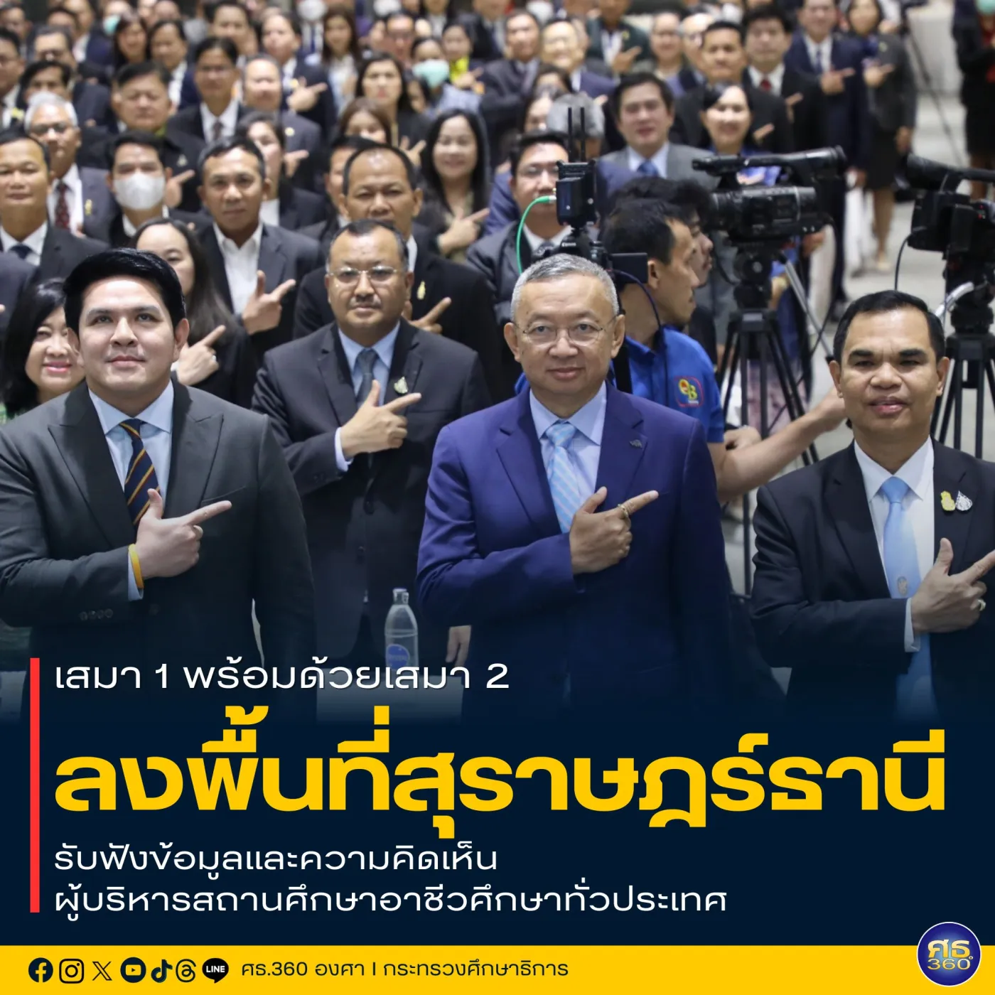 สิ่งสำคัญที่อยากเน้นย้ำผู้บริหาร สอศ. ต้องพร้อมขับเคลื่อนนโยบายภายใต้แนวทางการทำงาน “จับมือไว้ แล้วไปด้วยกัน” และใช้สำนวนที่เข้าใจง่ายคือ “เรียนดี มีความสุข” ที่ได้มอบไว้เมื่อ 14 กันยายน ที่ผ่านมา ให้เน้นลดภาระครูและบุคลากรทางการศึกษา ด้วยการปรับวิธีการประเมินวิทยฐานะ, โยกย้ายกลับภูมิลำเนาด้วยความโปร่งใส, แก้ไขปัญหาหนี้สิน, จัดหาอุปกรณ์การสอนและสวัสดิการ 1 ครู 1 Tablet และเร่งลดภาระนักเรียนและผู้ปกครอง ด้วยการเรียนได้ทุกที่ ทุกเวลา, 1 อำเภอ 1 โรงเรียนคุณภาพ, ระบบแนะแนวการเรียนและเป้าหมายชีวิต, การจัดทำระบบวัดผลรับรองมาตรฐานวิชาชีพ, การจัดทำระบบวัดผลเทียบระดับการศึกษา, มีรายได้ระหว่างเรียน จบแล้วมีงานทำ สอดคล้องวิสัยทัศน์กระทรวงศึกษาธิการ “ภายในปี 2570 ผู้เรียนทุกช่วงวัยได้รับการพัฒนาเต็มตามศักยภาพ มีคุณธรรม จริยธรรม มีทักษะที่จำเป็น พร้อมเรียนรู้ตลอดชีวิต และปรับตัวสอดคล้องกับวิถีชีวิตโลกยุคใหม่”