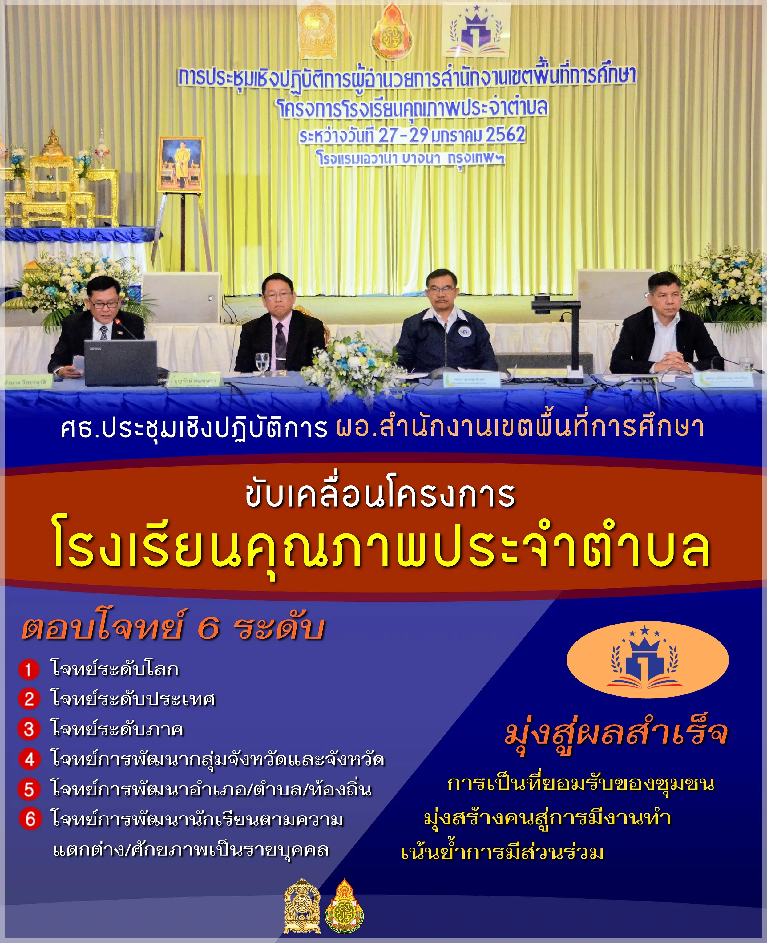 พล.อ.สุรเชษฐ์ ชัยวงศ์ รัฐมนตรีช่วยว่าการกระทรวงศึกษาธิการ เป็นประธานเปิดการประชุมเชิงปฏิบัติการผู้อำนวยการสำนักงานเขตพื้นที่การศึกษา “โครงการโรงเรียนคุณภาพประจำตำบล (1 ตำบล 1 โรงเรียนคุณภาพ)” พร้อมทั้งมอบนโยบายแก่ผู้อำนวยการสำนักงานเขตพื้นที่การศึกษาประถมศึกษาทั่วประเทศและผู้เกี่ยวข้องกว่า 200 คน เมื่อวันอาทิตย์ที่ 27 มกราคม 2562 ณ โรงแรมเอวาน่า กรุงเทพ บางนา