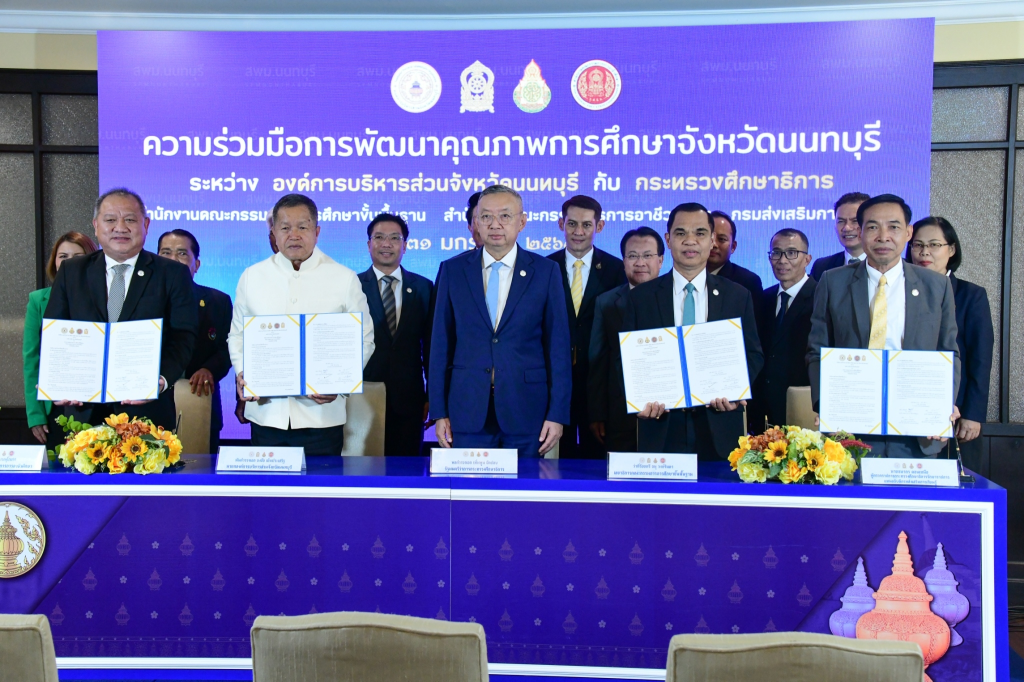 บันทึกข้อตกลงนี้ลงนามโดยพันตำรวจเอก ธงชัย เย็นประเสริฐ นายกองค์การบริหารส่วนจังหวัดนนทบุรี กับ ว่าที่ร้อยตรีธนุ วงษ์จินดา เลขาธิการ กพฐ., นายยศพล เวณุโกเศศ เลขาธิการ กอศ. นนทบุรี และนายธนากร ดอนเหนือ ผู้ตรวจราชการกระทรวงศึกษาธิการ รักษาราชการแทนอธิบดีกรมส่งเสริมการเรียนรู้ โดยมีนายสุรศักดิ์ พันธ์เจริญวรกุล รัฐมนตรีช่วยว่าการกระทรวงศึกษาธิการ ผู้บริหารฝ่ายการเมือง นายสุเทพ แก่งสันเทียะ ปลัดกระทรวงศึกษาธิการ ผู้บริหารกระทรวงศึกษาธิการ และหน่วยงานที่เกี่ยวข้อง ร่วมพิธีลงนาม ณ โถงอาคารราชวัลลภ ชั้น 1 กระทรวงศึกษาธิการ
