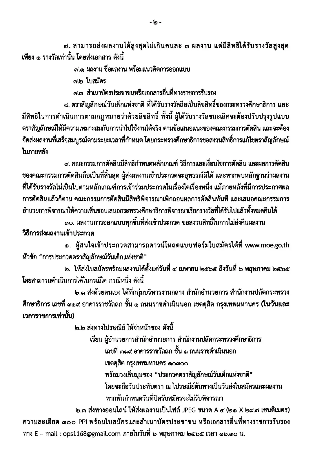 • ส่งทางไปรษณีย์ ให้จ่าหน้าซอง ดังนี้ เรียน ผู้อำนวยการสำนักอำนวยการ สำนักงานปลัดกระทรวงศึกษาธิการ เลขที่ 319 อาคารราชวัลลภ ชั้น 1 ถนนราชดำเนินนอก เขตดุสิต กรุงเทพฯ 10300 พร้อมวงเล็บมุมชอง “ประกวดตราสัญลักษณ์วันเด็กแห่งชาติ” โดยจะถือวันประทับตรา ณ ไปรษณีย์ตันทางเป็นวันส่งใบสมัครและผลงาน หากพ้นกำหนดวันที่ปิดรับสมัครจะไม่รับพิจารณา