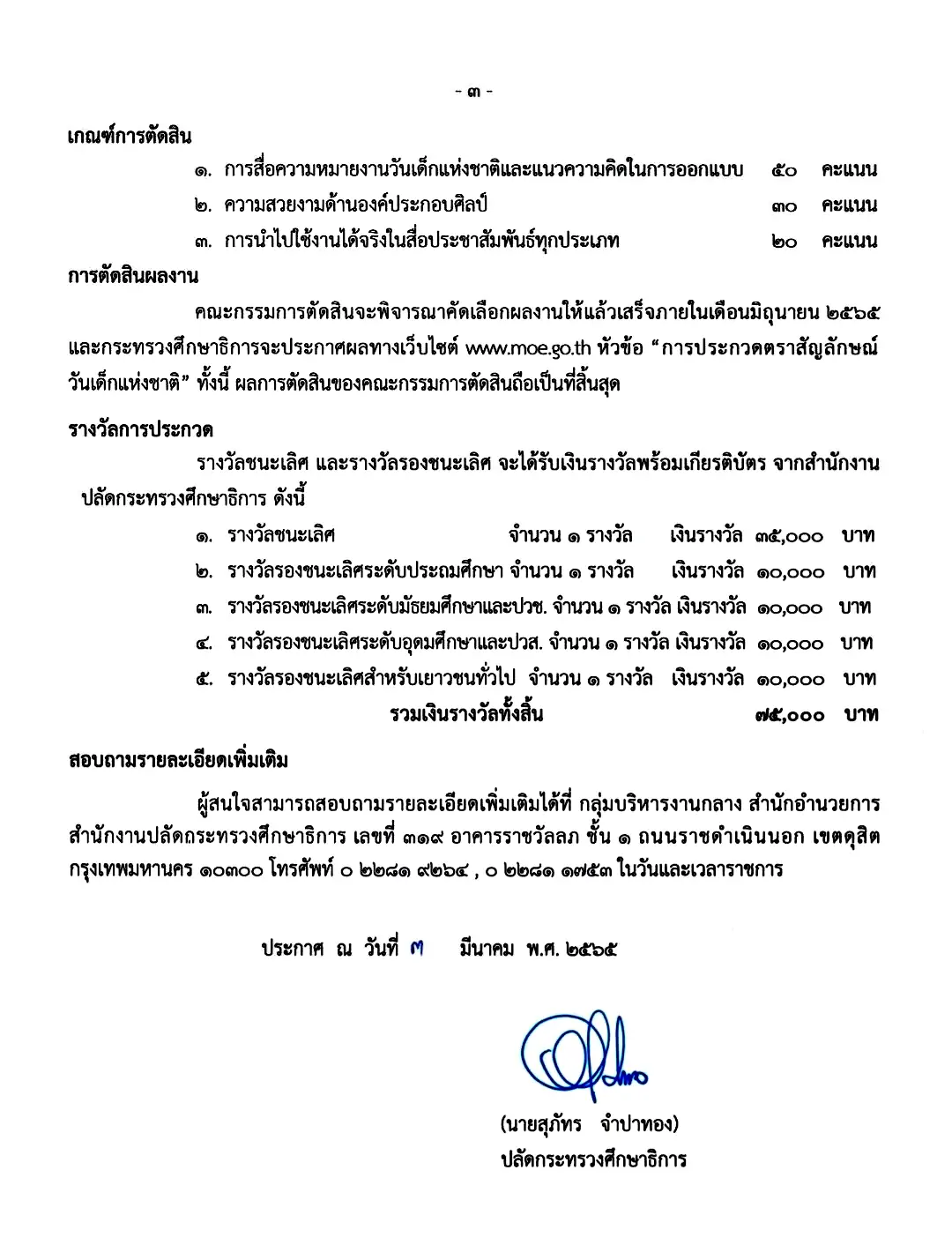 รางวัลการประกวด รางวัลชนะเลิศ 35,000 บาท และรางวัลรองชนะเลิศ 4 ระดับ ๆ ละ 10,000 บาท รวมเงินรางวัลทั้งสิ้น 75,000 บาท พร้อมเกียรติบัตร จากสำนักงานปลัดกระทรวงศึกษาธิการ