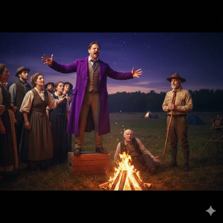 - ชายเสื้อสีม่วง: ท่าทางมั่นใจ พูดจาโผงผาง (ยืนบนกล่องไม้)