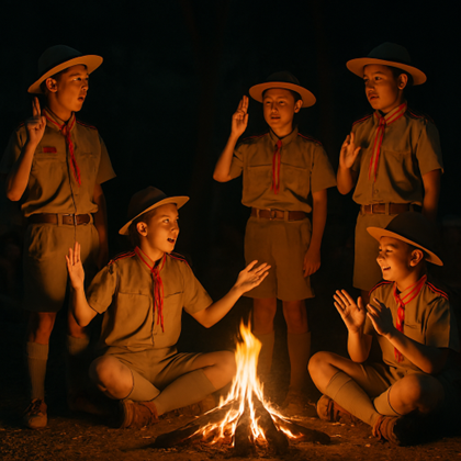 ฉาก: รอบกองไฟยามค่ำคืน ลูกเสือนั่งล้อมวง กองไฟส่องแสงอบอุ่น
