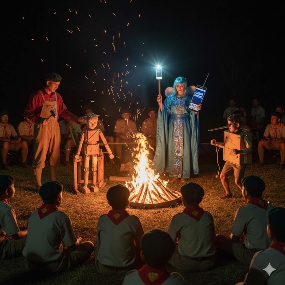 • นางฟ้า: (โผล่มาพร้อมเสียงไซเรน) “หยุด! ฉันคือนางฟ้าไซเบอร์ จะเสกหุ่นไม้ตัวนี้ให้มีชีวิต ตั้งชื่อว่า พินอคคิโอ        แต่มีกฎนะ!… เจ้าต้องรักษา กฎลูกเสือข้อที่ 1 คือมีเกียรติ เชื่อถือได้ ถ้าเจ้าโกหก จมูกของเจ้าจะยาวออกมาทันที!”