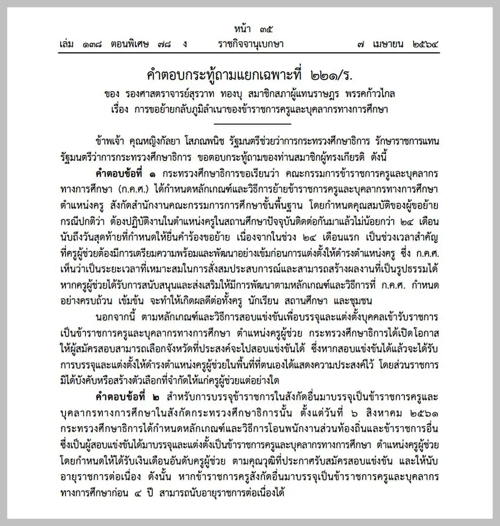 กระทรวงศึกษาธิการ ตอบกระทู้ถามทั่วไปในราชกิจจานุเบกษา เมื่อวันที่ 7 เมษายน 2564 ใน 2 คำถาม เกี่ยวกับหลักเกณฑ์ฯ การบรรจุข้าราชการครูใหม่ที่ต้องปฏิบัติงานในสถานศึกษาเดิม จึงจะย้ายได้ และหลักเกณฑ์ฯ การโอนพนักงานส่วนท้องถิ่น/ข้าราชการอื่น ซึ่งเป็นผู้สอบแข่งขันได้มาบรรจุแต่งตั้งเป็นข้าราชการครู ตำแหน่งครูผู้ช่วย สามารถนับอายุราชการต่อเนื่องได้