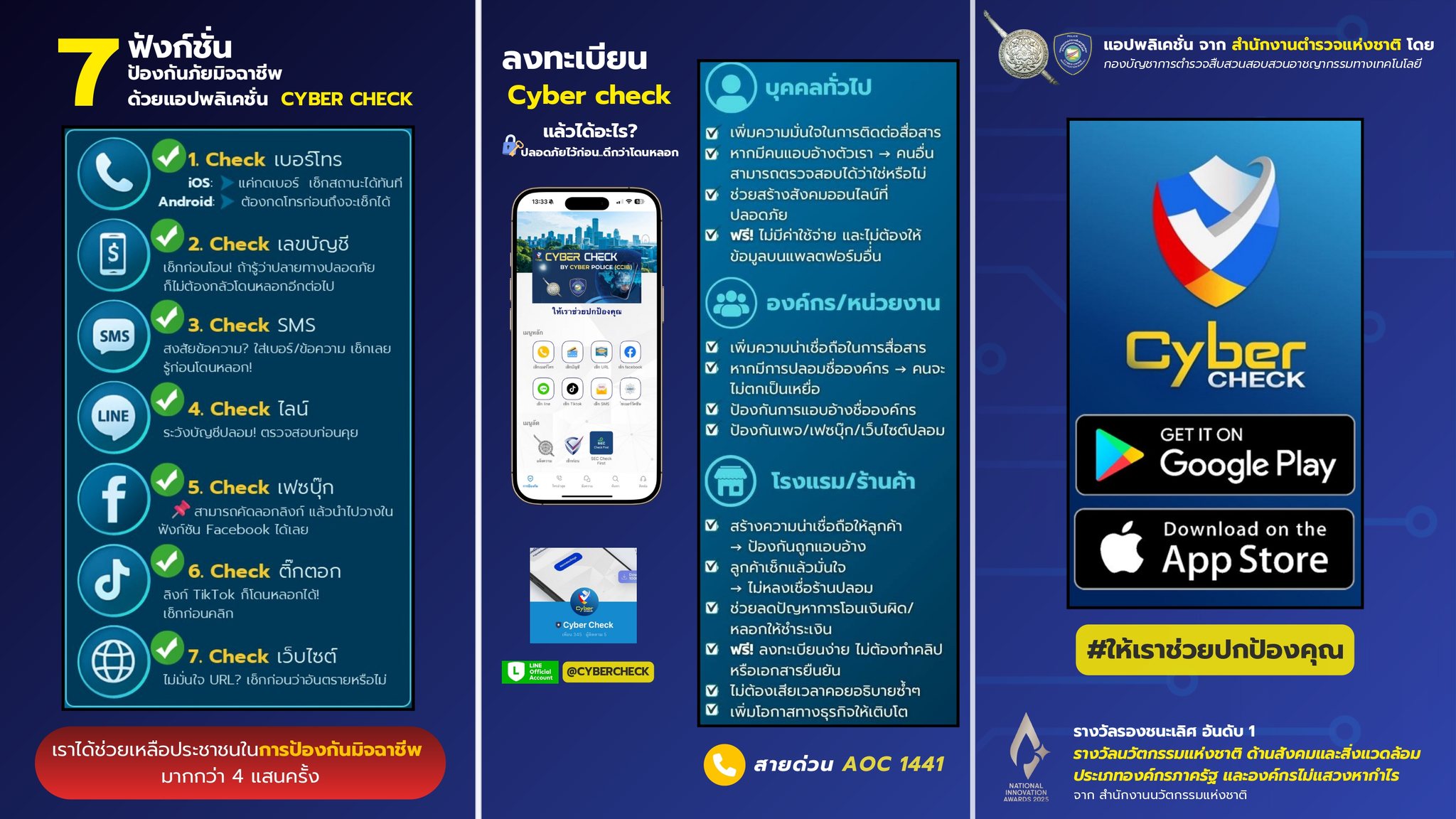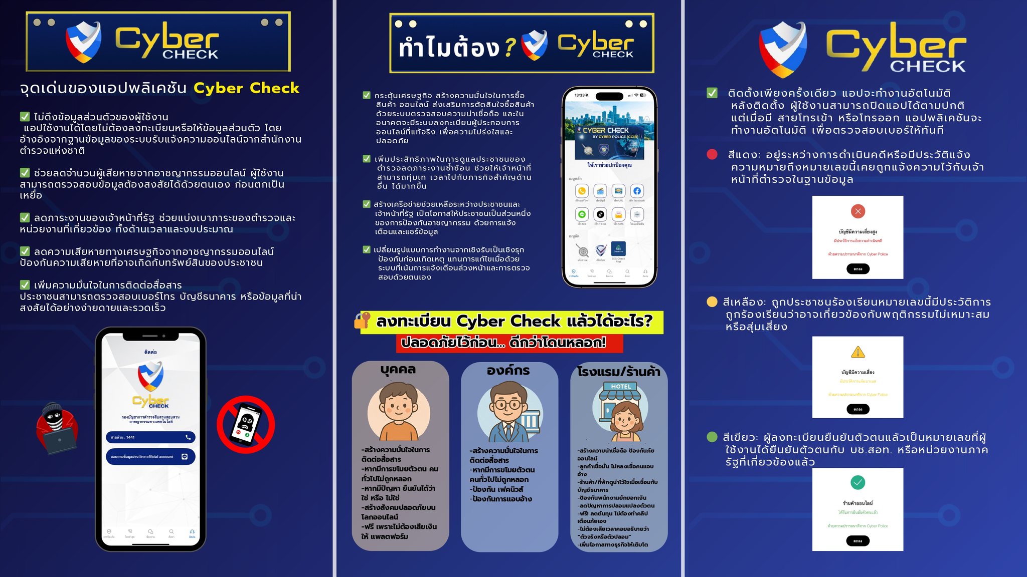 แอปพลิเคชัน Cyber Check คือเครื่องมือป้องกันภัยไซเบอร์ที่ใช้งานง่าย ทรงพลัง และน่าเชื่อถือ ซึ่งออกแบบมาเพื่อคนไทยทุกคน การมีแอปนี้ติดเครื่องไว้ก็เปรียบเสมือนการมีเกราะป้องกันตัวเองจากมิจฉาชีพออนไลน์ที่พร้อมจะฉกฉวยโอกาสอยู่เสมอ ในโลกที่ความเสี่ยงแฝงตัวอยู่ทุกที่ การป้องกันไว้ก่อนย่อมดีกว่าการตามแก้ไขปัญหาในภายหลังอย่างแน่นอน