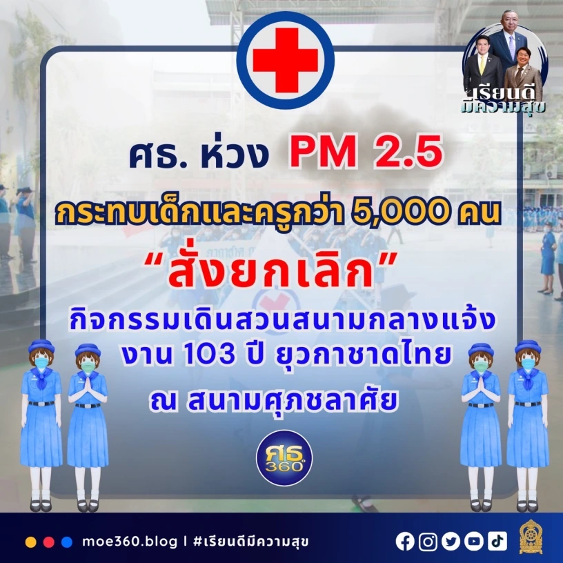 ศธ. ห่วง PM 2.5 กระทบเด็กและครูกว่า 5,000 คน สั่งยกเลิกกิจกรรมเดินสวนสนามกลางแจ้ง งาน 103 ปี ยุวกาชาดไทย ที่สนามศุภฯ