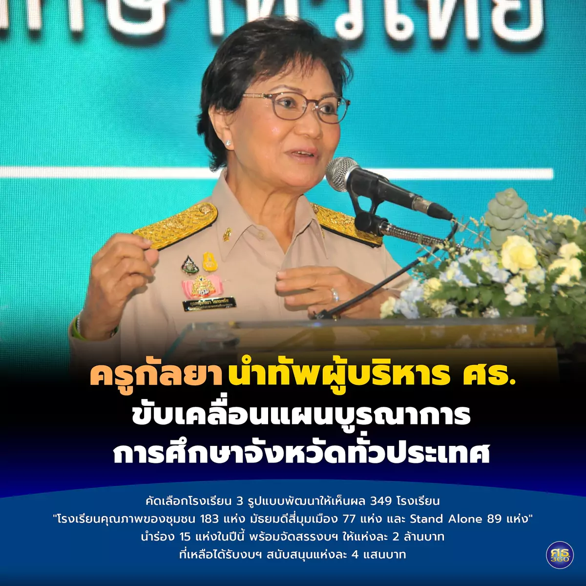 “ครูกัลยา” นำทัพผู้บริหาร 4 องค์กรหลักกระทรวงศึกษาธิการ ขับเคลื่อนแผนบูรณาการการศึกษาจังหวัดทั่วประเทศ คัดเลือกโรงเรียน 3 รูปแบบพัฒนาให้เห็นผล 349 โรงเรียน คือ โรงเรียนคุณภาพของชุมชน 183 แห่ง โรงเรียนมัธยมดีสี่มุมเมือง 77 แห่ง และโรงเรียน Stand Alone 89 แห่ง นำร่อง 15 แห่งก่อนในปีนี้ พร้อมจัดสรรงบฯ ให้แห่งละ 2 ล้านบาท ที่เหลือได้รับงบฯ สนับสนุนแห่งละไม่เกิน 4 แสนบาท