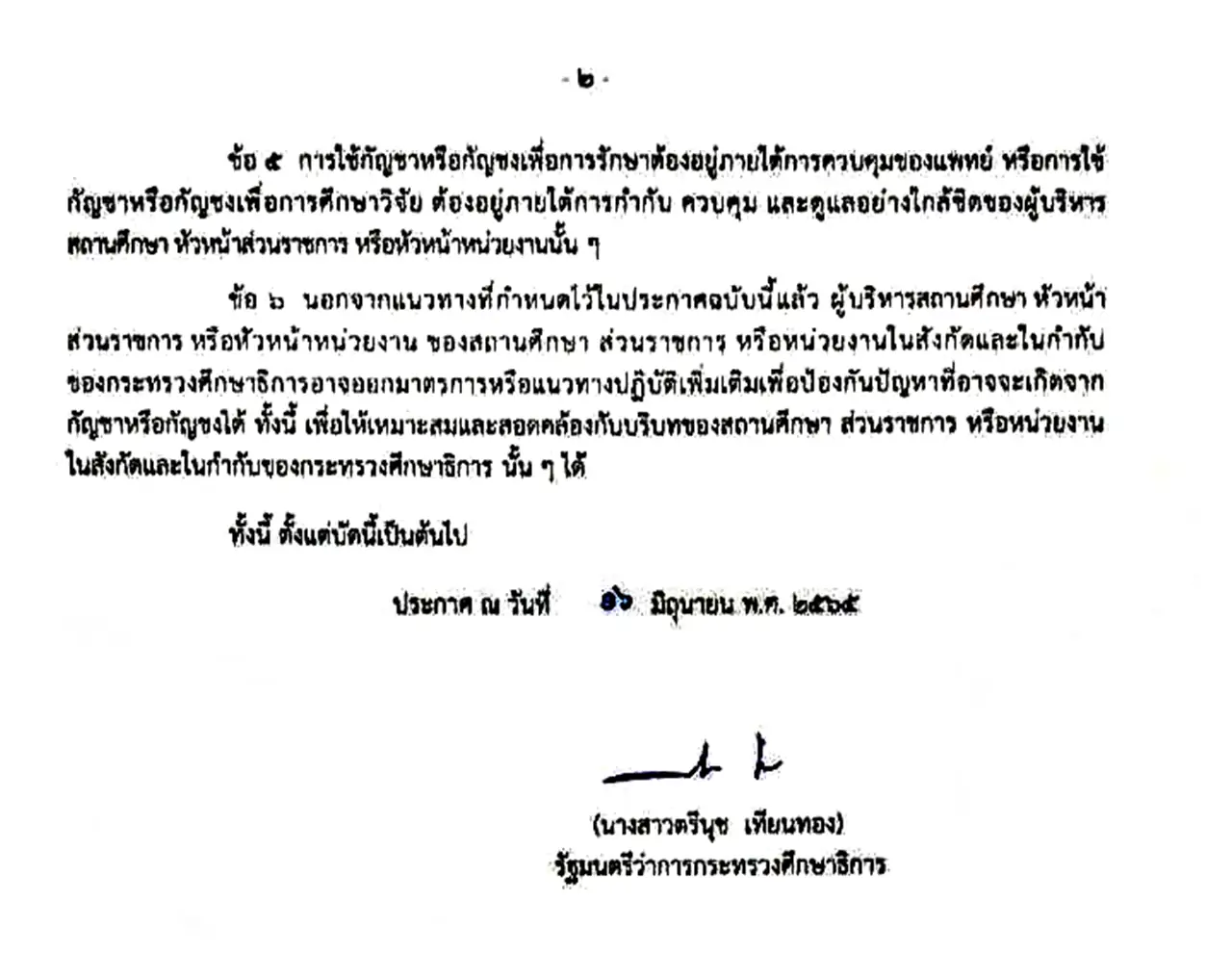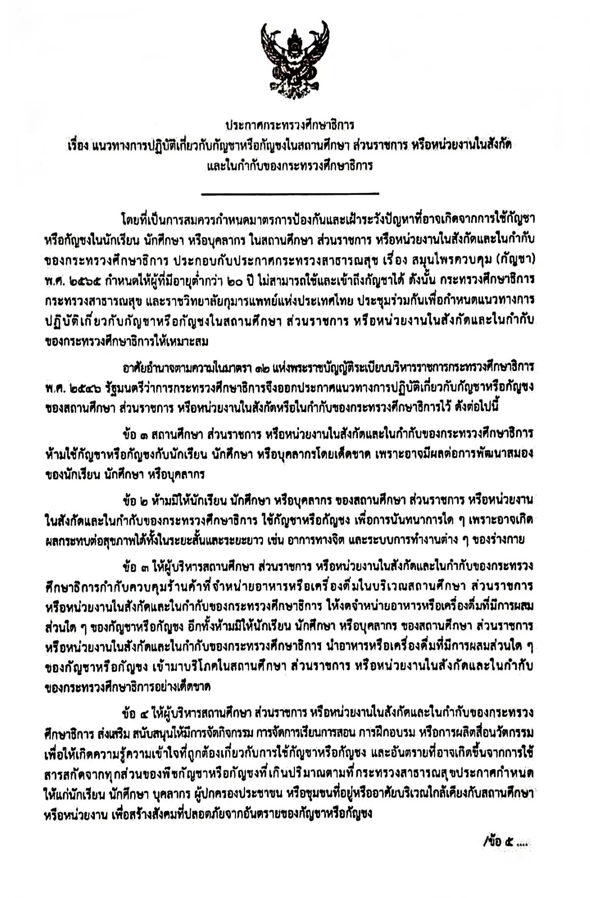 ข้อ 1 สถานศึกษา ส่วนราชการ หรือหน่วยงานในสังกัดและในกำกับของกระทรวงศึกษาธิการ ห้ามใช้กัญชาหรือกัญชงกับนักเรียน นักศึกษา หรือบุคลากรโดยเด็ดขาด เพราะอาจมีผลต่อการพัฒนาสมองของนักเรียน นักศึกษา หรือบุคลากร