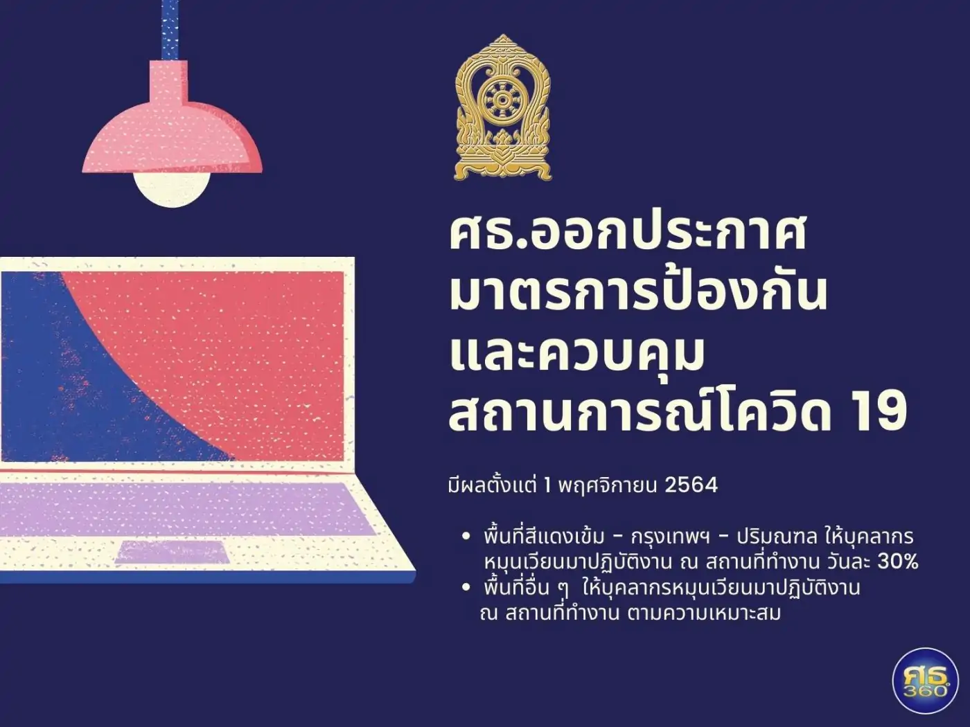 เนื่องจากรัฐบาลได้กำหนดมาตรการป้องกันควบคุมโรคติดเชื้อไวรัสโคโรนา 2019 แบบบูรณาการ ตามระดับของพื้นที่สถานการณ์ย่อยในพื้นที่ทั่วราชอาณาจักร เพื่อรองรับการเปิดประเทศ ในวันที่ 1 พฤศจิกายน 2564 โดยกำหนดให้หน่วยงานของรัฐในพื้นที่ควบคุมสูงสุดและเข้มงวด ปฏิบัติงาน ณ ที่พักอาศัย (Work From Home) อย่างน้อยร้อยละ 70 สำหรับหน่วยงานของรัฐในพื้นที่ควบคุมสูงสุด พื้นที่ควบคุม พื้นที่เฝ้าระวังสูง พื้นที่เฝ้าระวัง และพื้นที่นำร่องการท่องเที่ยว ให้ดำเนินการได้ตามความเหมาะสม ยกเว้น กรุงเทพมหานครและปริมณฑล ปฏิบัติงาน ณ ที่พักอาศัย (Work From Home) อย่างน้อยร้อยละ 70