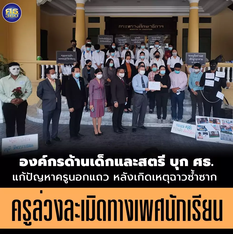 องค์กรด้านเด็กและสตรี บุกกระทรวงศึกษาธิการ (ศธ.) ทวงถามความคืบหน้า แก้ปัญหาครูนอกแถว หลังเกิดเหตุฉาวซ้ำซาก ย้ำขอให้ ศธ.จัดหนัก แก้ปัญหาล่วงละเมิดทางเพศนักเรียนอย่างจริงจัง