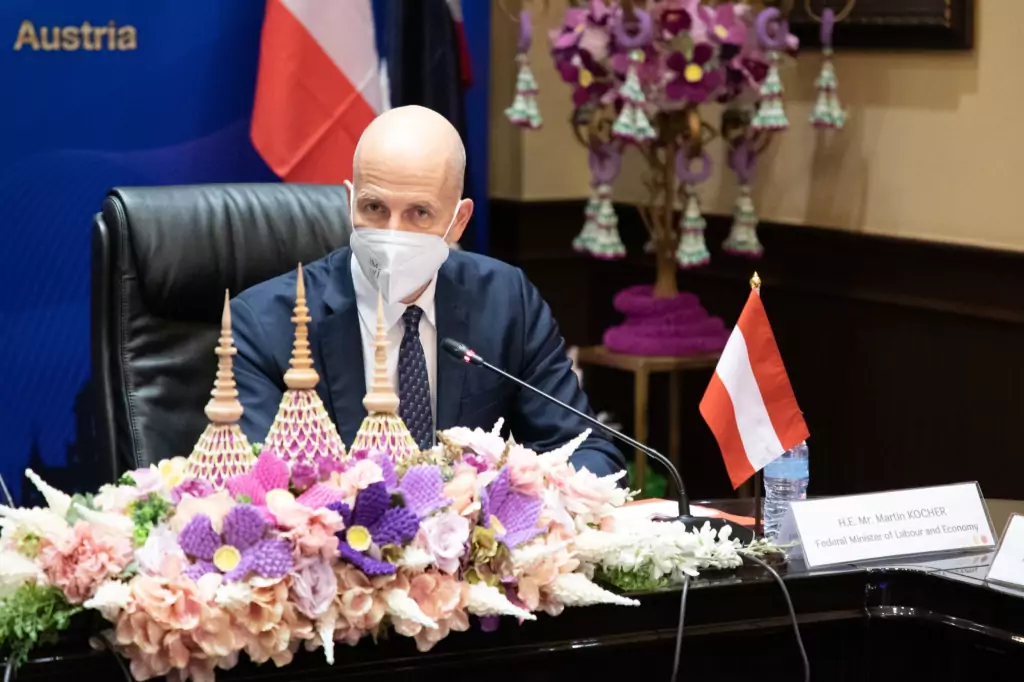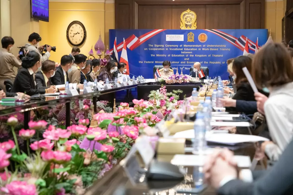 14 พฤศจิกายน 2565, ห้องประชุมราชวัลลภ / คุณหญิงกัลยา โสภณพนิช รัฐมนตรีช่วยว่าการกระทรวงศึกษาธิการ และ Mr. Martin Kocher รัฐมนตรีว่าการกระทรวงแรงงานและเศรษฐกิจแห่งสาธารณรัฐออสเตรีย ลงนามในบันทึกความเข้าใจว่าด้วยความร่วมมือ (MOU) ในการฝึกอบรมโดยใช้การทำงานเป็นฐาน
