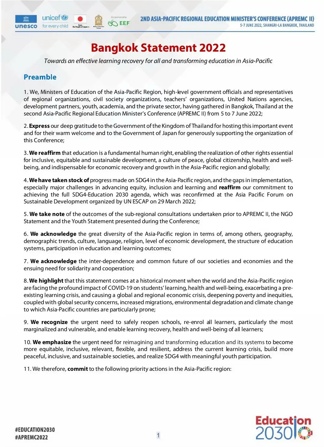 “ถ้อยแถลงกรุงเทพฯ 2565 (Bangkok Statement 2022) มุ่งสู่การฟื้นฟูการเรียนรู้ที่มีประสิทธิภาพสำหรับทุกคนและการพลิกโฉมการศึกษาในภูมิภาคเอเชีย-แปซิฟิก” ซึ่งเป็น (ร่าง) จากการประชุมระดับรัฐมนตรีด้านการศึกษาแห่งภูมิภาคเอเชีย-แปซิฟิกว่าด้วยเป้าหมายการพัฒนาที่ยั่งยืน เป้าหมายที่ 4 (การศึกษา 2030) ครั้งที่ 2 หรือ APREMC-II ซึ่งประเทศไทยเป็นเจ้าภาพจัดการประชุม ระหว่างวันที่ 5-7 มิถุนายน 2565 ณ กรุงเทพมหานคร โคยมีรัฐมนตรีศึกษาจากประเทศในภูมิภาคเอเชีย-แปซิฟิก เข้าร่วมการประชุม 17 ประเทศ เข้าร่วมการประชุมแบบทางไกล 3 ประเทศ ผู้แทนองค์การระหว่างประเทศ หน่วยงาน องค์กรพัฒนาเอกชนและภาคประชาสังคมที่เกี่ยวข้องเข้าร่วมการประชุมประมาณ 350 คน