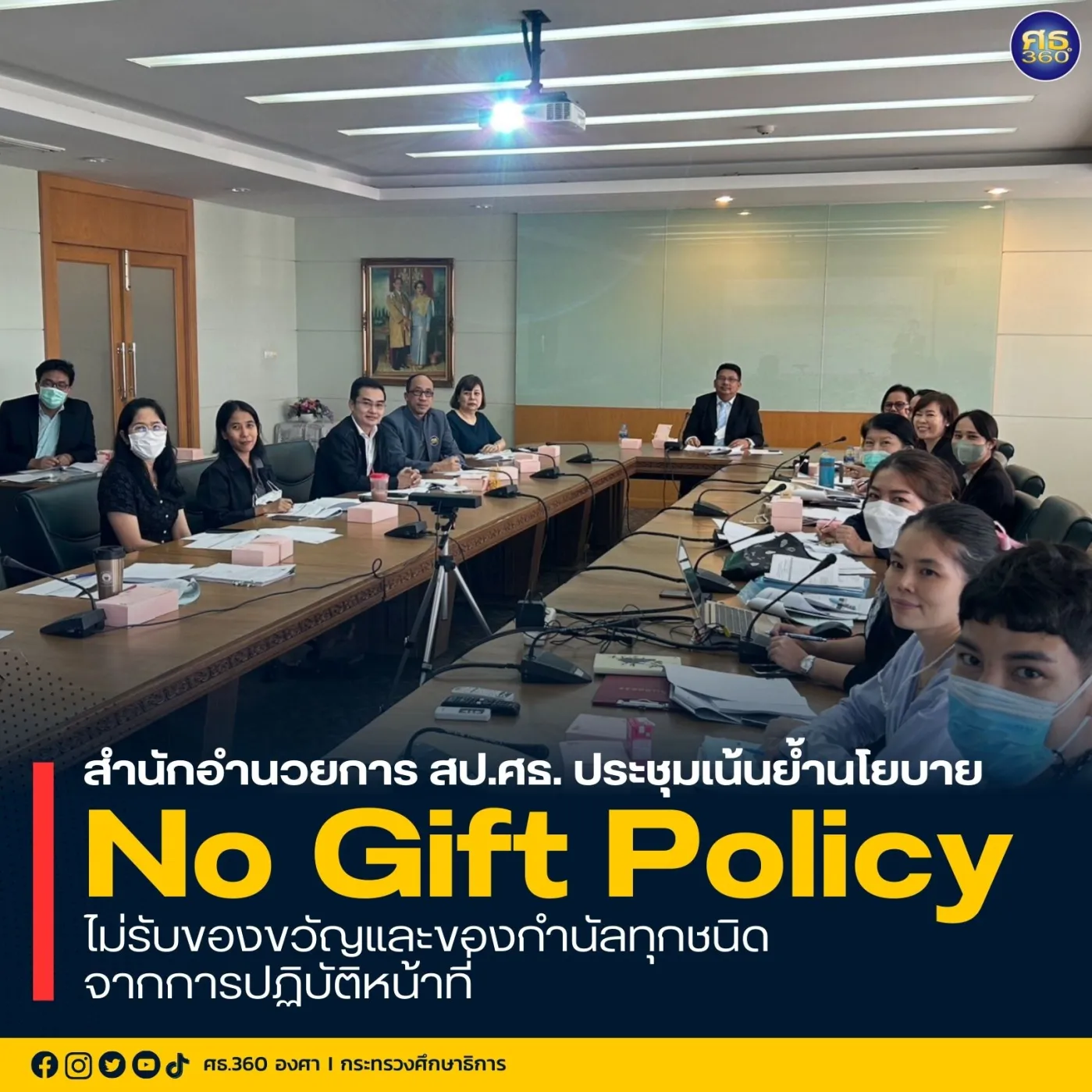 5 เมษายน 2566 – นายชาญวุฒิ วงศ์เพ็ง ผู้อำนวยการสำนักอำนวยการ สำนักงานปลัดกระทรวงศึกษาธิการ (สอ.สป.) ประชุมขับเคลื่อนนโยบายการไม่รับของขวัญและของกำนัลทุกชนิดจากการปฏิบัติหน้าที่ (No Gift Policy) เพื่อรณรงค์ให้บุคลากรทุกระดับ ไม่กระทำการอันเป็นการขัดกันระหว่างประโยชน์ส่วนบุคคลกับประโยชน์ส่วนรวม โดยไม่รับของขวัญและของกำนัลทุกชนิดจากการปฏิบัติหน้าที่ งดรับของขวัญบุคคลภายนอกผู้มาติดต่อราชการในทุกช่วงเทศกาล ตามนโยบายกระทรวงศึกษาธิการและสำนักงานปลัดกระทรวงศึกษาธิการ โดยมีผู้อำนวยการกลุ่ม/ศูนย์ในสังกัด สอ.สป. เข้าร่วมประชุมเพื่อนำไปขยายผล ณ ห้องประชุมสะอาด พิมพ์สวัสดิ์