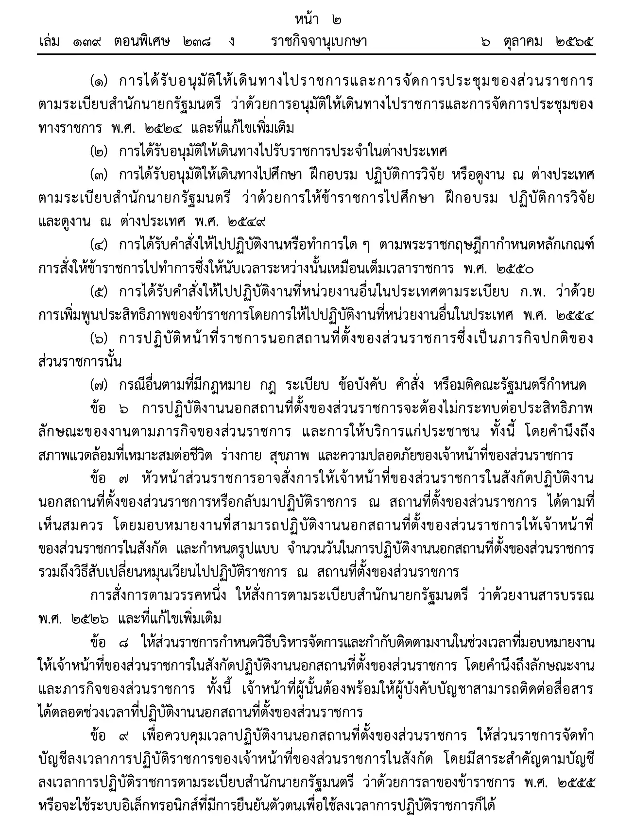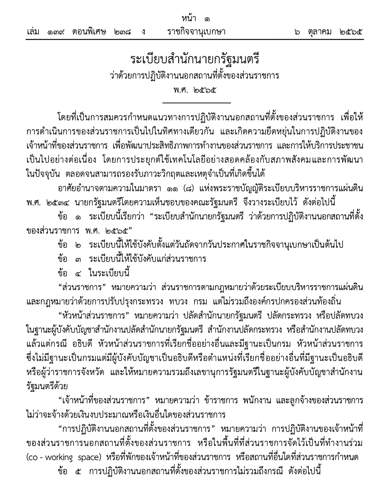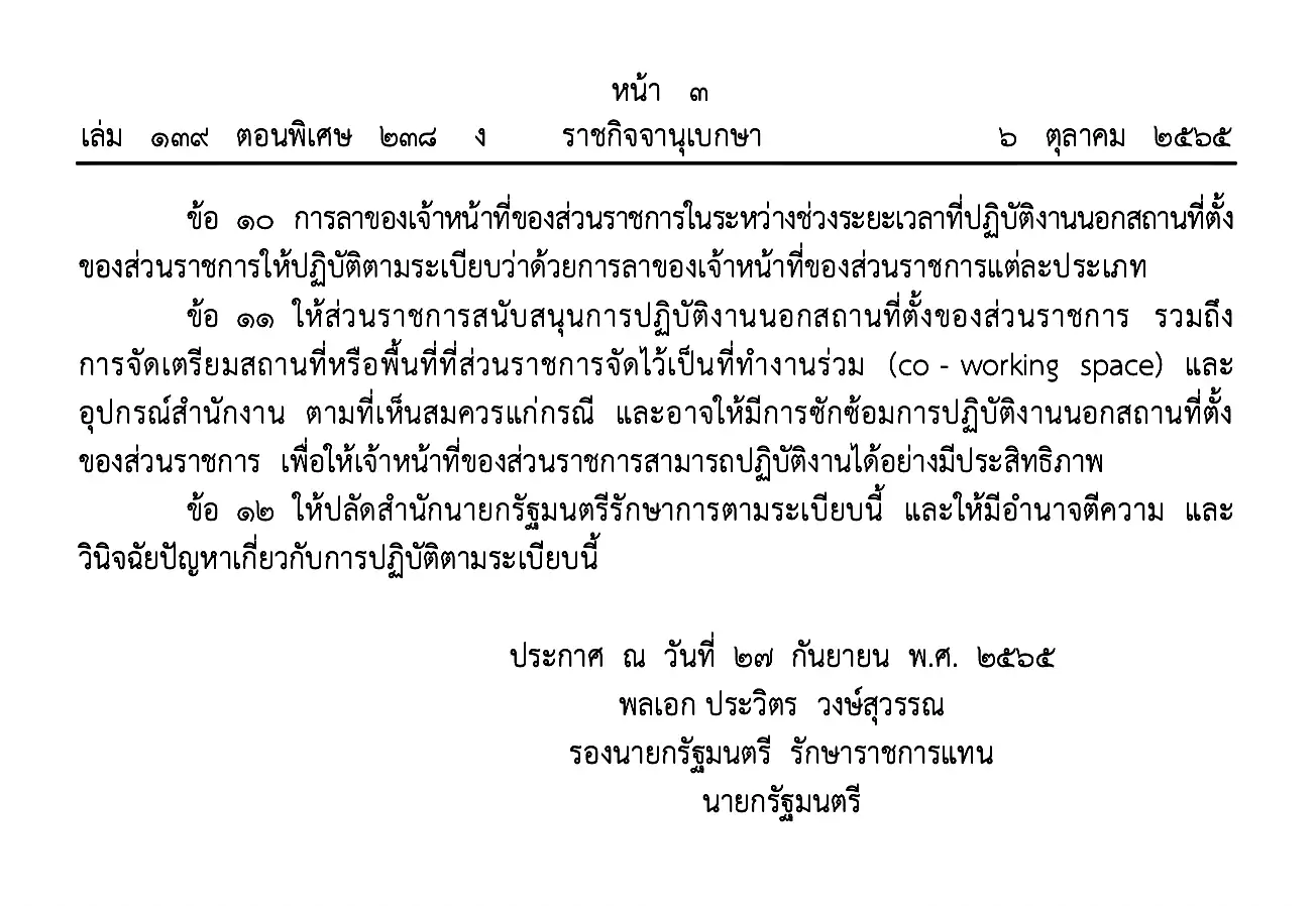 ราชกิจจานุเบกษา เมื่อวันที่ 6 ตุลาคม 2565 เผยแพร่ระเบียบสำนักนายกรัฐมนตรี ว่าด้วยการปฏิบัติงานนอกสถานที่ตั้งของส่วนราชการ พ.ศ. 2565