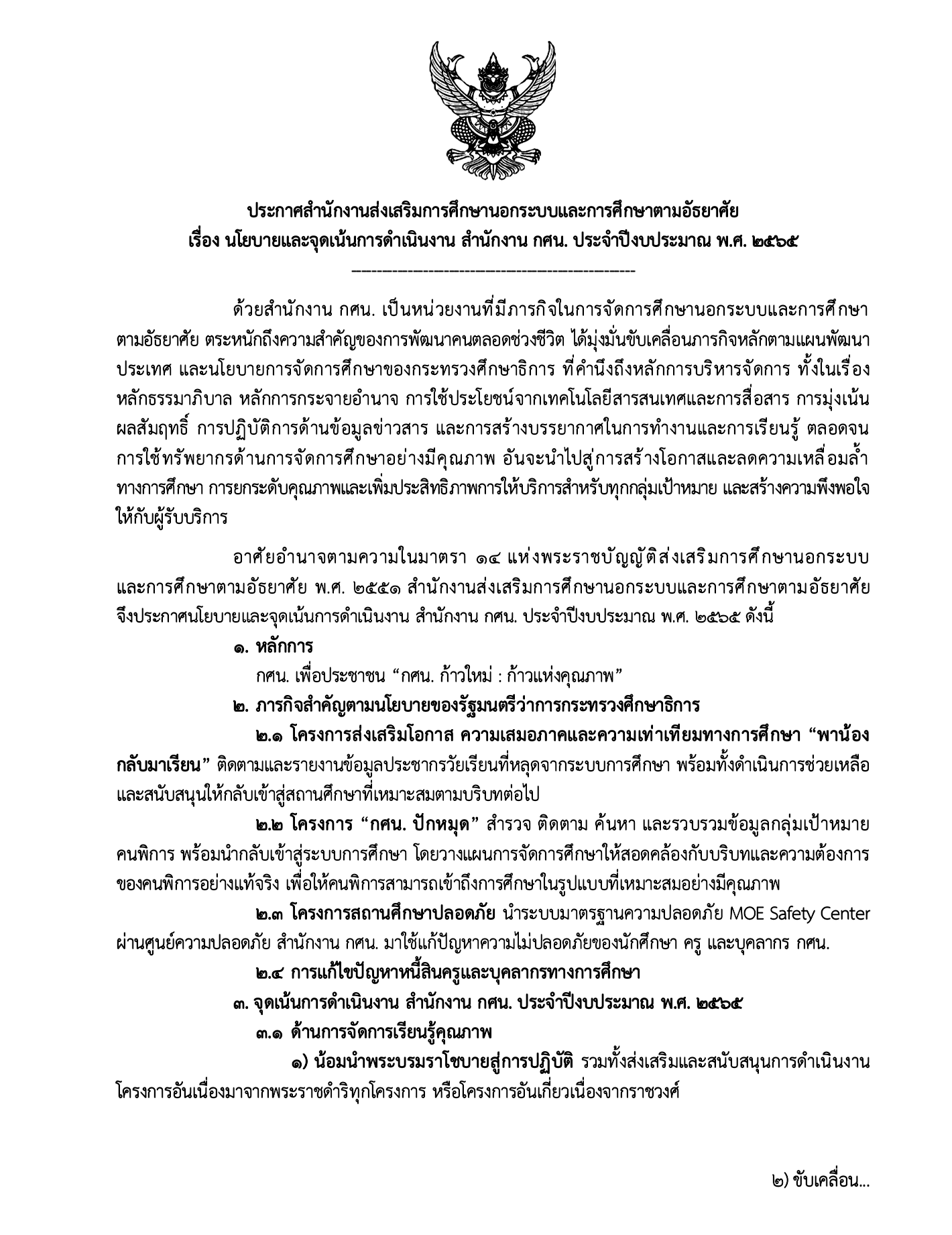 อาศัยอํานาจตามความในมาตรา ๑๔ แห่งพระราชบัญญัติส่งเสริมการศึกษานอกระบบและการศึกษาตามอัธยาศัย พ.ศ. ๒๕๕๑ สํานักงานส่งเสริมการศึกษานอกระบบและการศึกษาตามอัธยาศัยจึงประกาศนโยบายและจุดเน้นการดําเนินงาน สํานักงาน กศน. ประจําปีงบประมาณ พ.ศ. ๒๕๖๕ ดังนี้