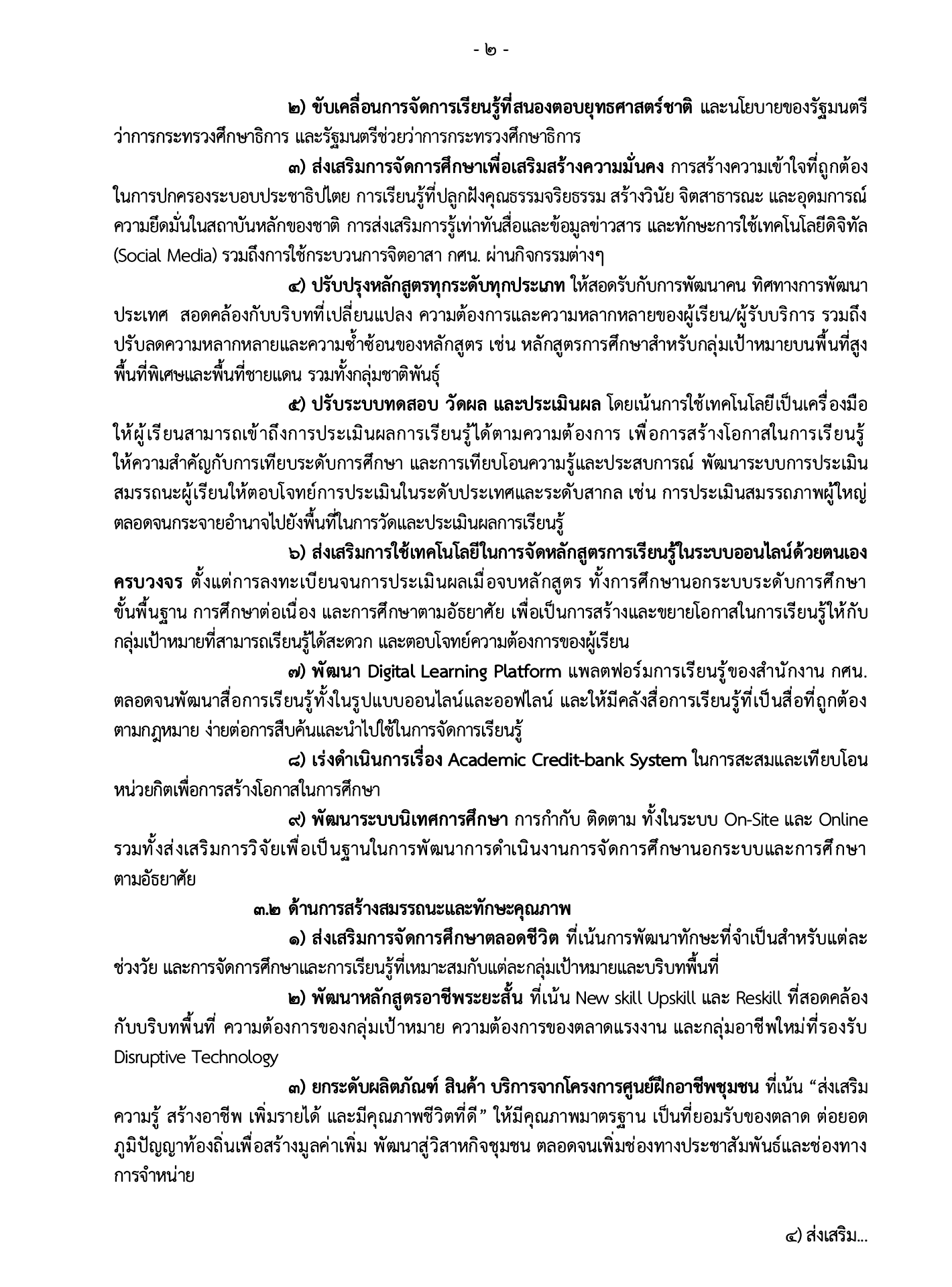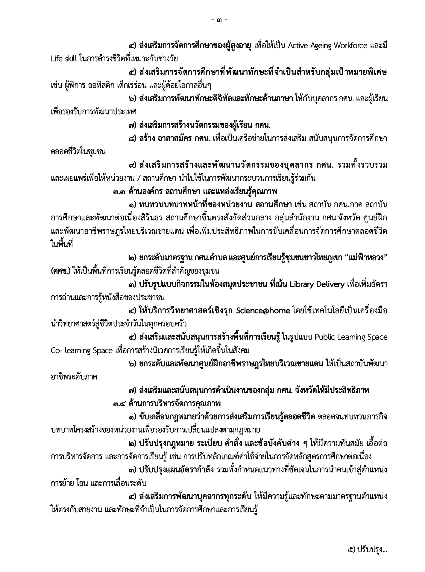 ๑) ขับเคลื่อนกฎหมายว่าด้วยการส่งเสริมการเรียนรู้ตลอดชีวิต ตลอดจนทบทวนภารกิจ บทบาทโครงสร้างของหน่วยงานเพื่อรองรับการเปลี่ยนแปลงตามกฎหมาย
