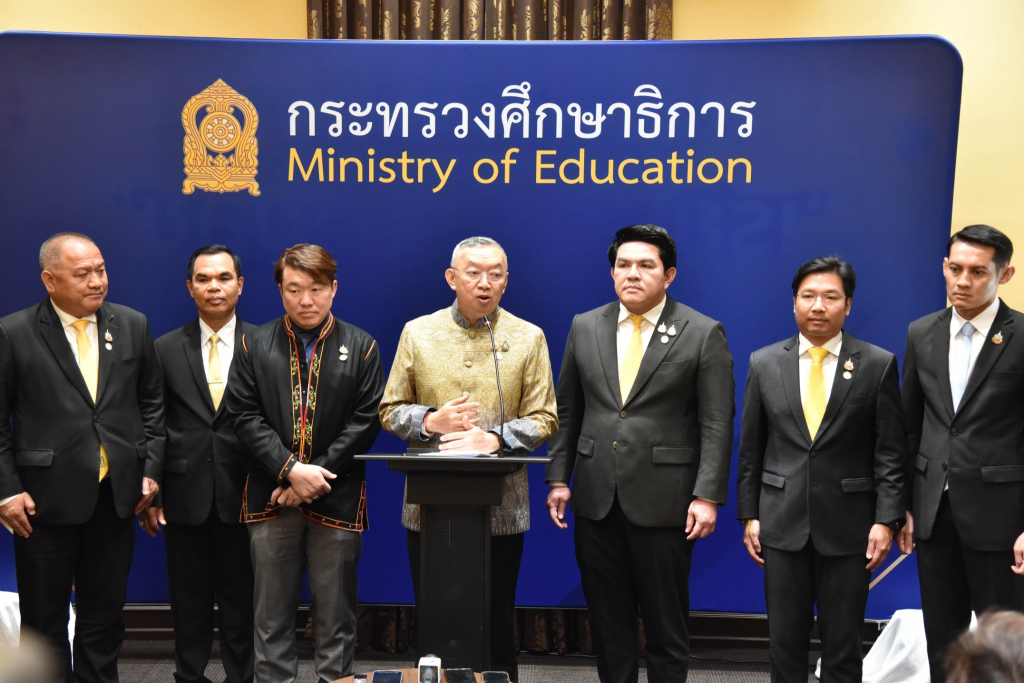ภายหลังการประชุม รมว.ศธ. พร้อมด้วยนายสุรศักดิ์ พันธ์เจริญวรกุล รมช.ศธ. นายสิริพงศ์ อังคสกุลเกียรติ คณะที่ปรึกษา รมว.ศธ. นายนพ ชีวานันท์ เลขานุการ รมว.ศธ. นายพิษณุ พลธี เลขานุการ รมช.ศธ. ว่าที่ร้อยตรี ธนุ วงษ์จินดา เลขาธิการ กพฐ. และนายยศพล เวณุโกเศศ เลขาธิการ กอศ. แถลงข่าว ณ ห้องแถลงข่าว