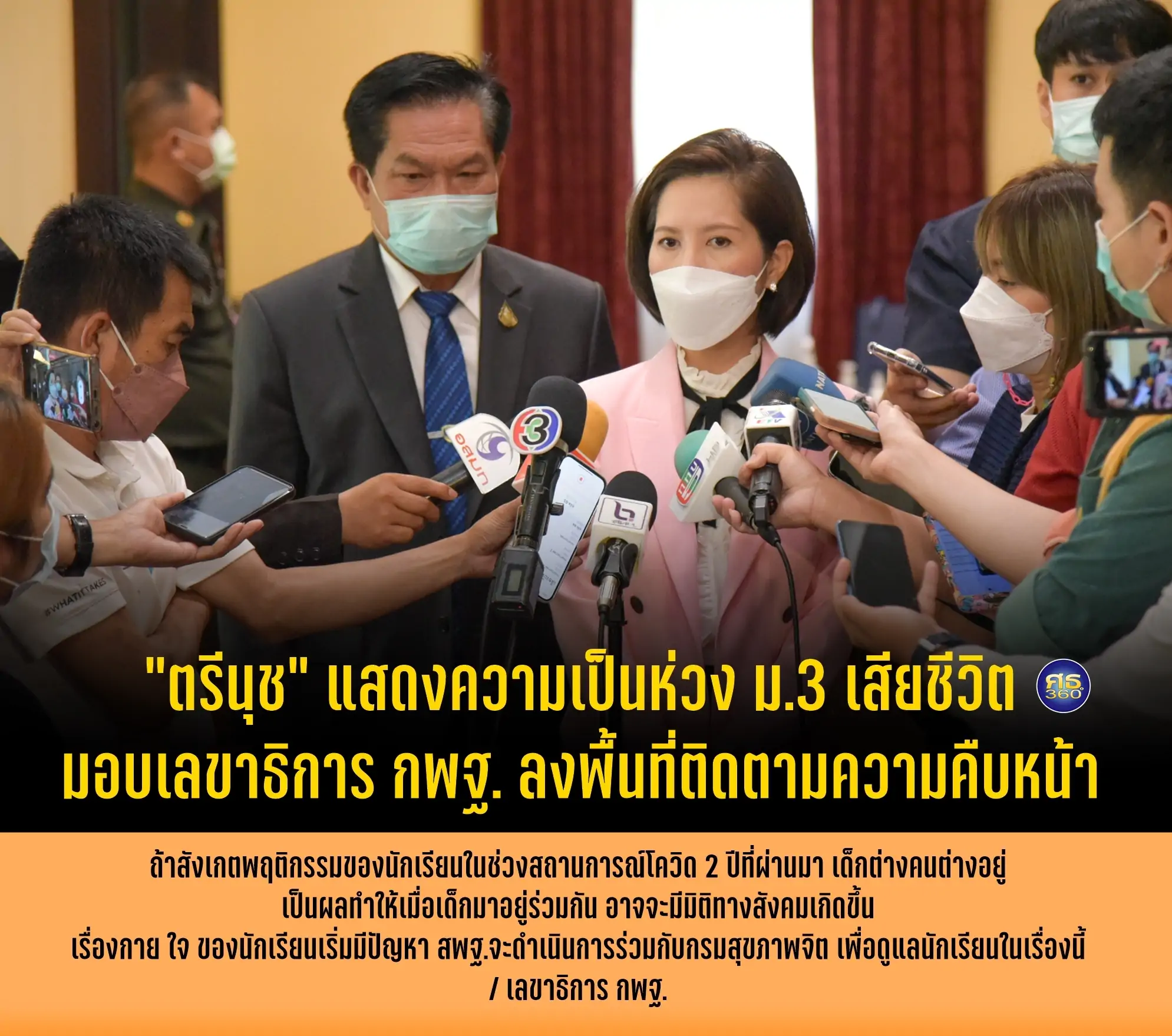 รมว.ศธ.”ตรีนุช” แสดงความเป็นห่วง เหตุการณ์นักเรียน ม.3 โรงเรียนมัธยมย่านบางบัวทองเสียชีวิต มอบเลขาธิการ กพฐ. ลงพื้นที่ติดตามความคืบหน้า ด้านเลขาฯ กพฐ. “อัมพร” พร้อมถอดบทเรียน ดูแลเฝ้าระวังติดตามพฤติกรรมเด็ก สถานการณ์โควิ...