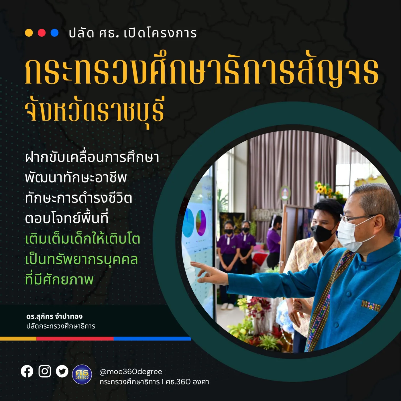 17 กันยายน 2565, จังหวัดราชบุรี / ดร.สุภัทร จำปาทอง ปลัดกระทรวงศึกษาธิการ เป็นประธานเปิดโครงการกระทรวงศึกษาธิการสัญจร จังหวัดราชบุรี ซึ่งครอบคลุมพื้นที่ภาคกลาง ภาคตะวันตก และภาคตะวันออก รวม 26 จังหวัด ณ โรงแรม ณ เวลา อำเ...