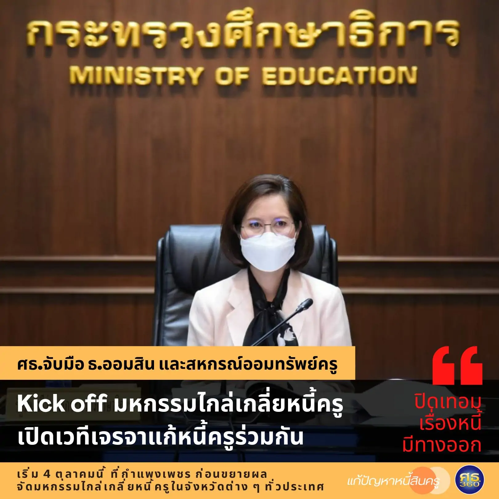 นางสาวตรีนุช เทียนทอง รัฐมนตรีว่าการกระทรวงศึกษาธิการ เปิดเผยความคืบหน้าในการแก้ไขปัญหาหนี้สินครูและบุคลากรทางการศึกษา กระทรวงศึกษาธิการ (ศธ.) ร่วมกับธนาคารออมสิน และสหกรณ์ออมทรัพย์ครู จัดมหกรรมไกล่เกลี่ยหนี้ “ปิดเทอม เร...