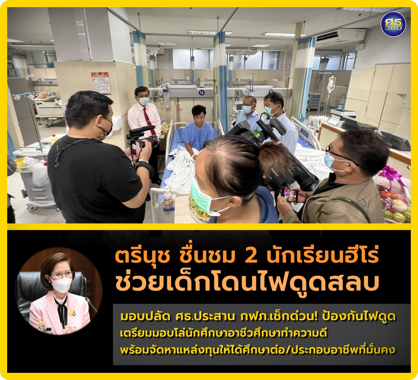 รมว.ศธ. “ตรีนุช” ชื่นชม 2 นักเรียนฮีโร่ อุดรธานี ช่วยเด็กโดนไฟดูดสลบ มอบปลัด ศธ.ประสานการไฟฟ้าส่วนภูมิภาค เช็กระบบไฟฟ้าใกล้โรงเรียนทั่วประเทศด่วน! ป้องกันไฟดูด เตรียมมอบโล่ในฐานะนักศึกษาอาชีวศึกษาทำความดี พร้อมจัดหาแหล่ง...