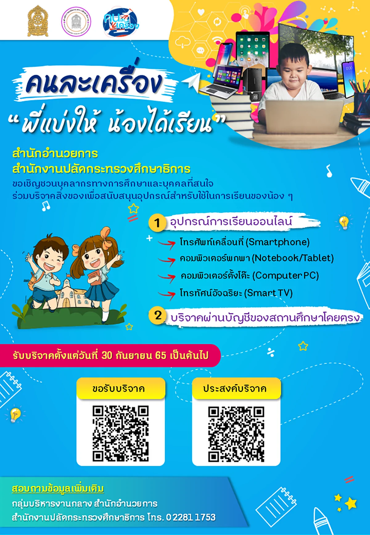 กระทรวงศึกษาธิการ (ศธ.) โดยสำนักงานปลัดกระทรวงศึกษาธิการ จัดทำโครงการรับบริจาคเพื่อสนับสนุนอุปกรณ์สำหรับใช้ในการเรียนของนักเรียน ในสังกัดกระทรวงศึกษาธิการ เพื่อให้สถานศึกษามีอุปกรณ์การเรียนออนไลน์ สามารถจัดสรรให้แก่นักเร...