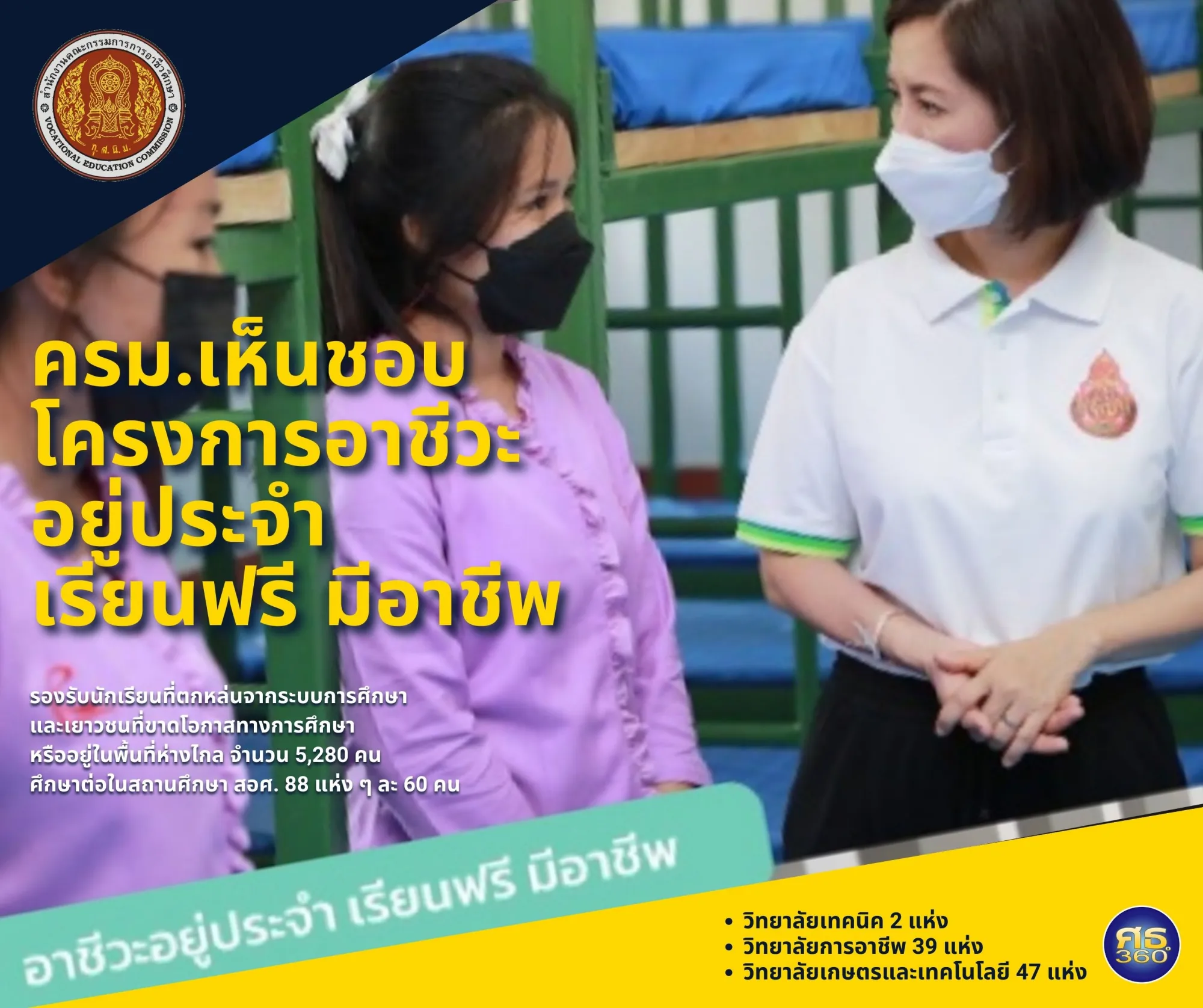ครม.เห็นชอบโครงการอาชีวะอยู่ประจำ เรียนฟรี มีอาชีพ 7 มิถุนายน 2565 / คณะรัฐมนตรีมีมติเห็นชอบโครงการอาชีวะสร้างโอกาสทางการศึกษาให้เยาวชน เพื่อผลิตกำลังคนของประเทศ (อาชีวะอยู่ประจำ เรียนฟรี มีอาชีพ) ในสถานศึกษาของรัฐ สังกั...