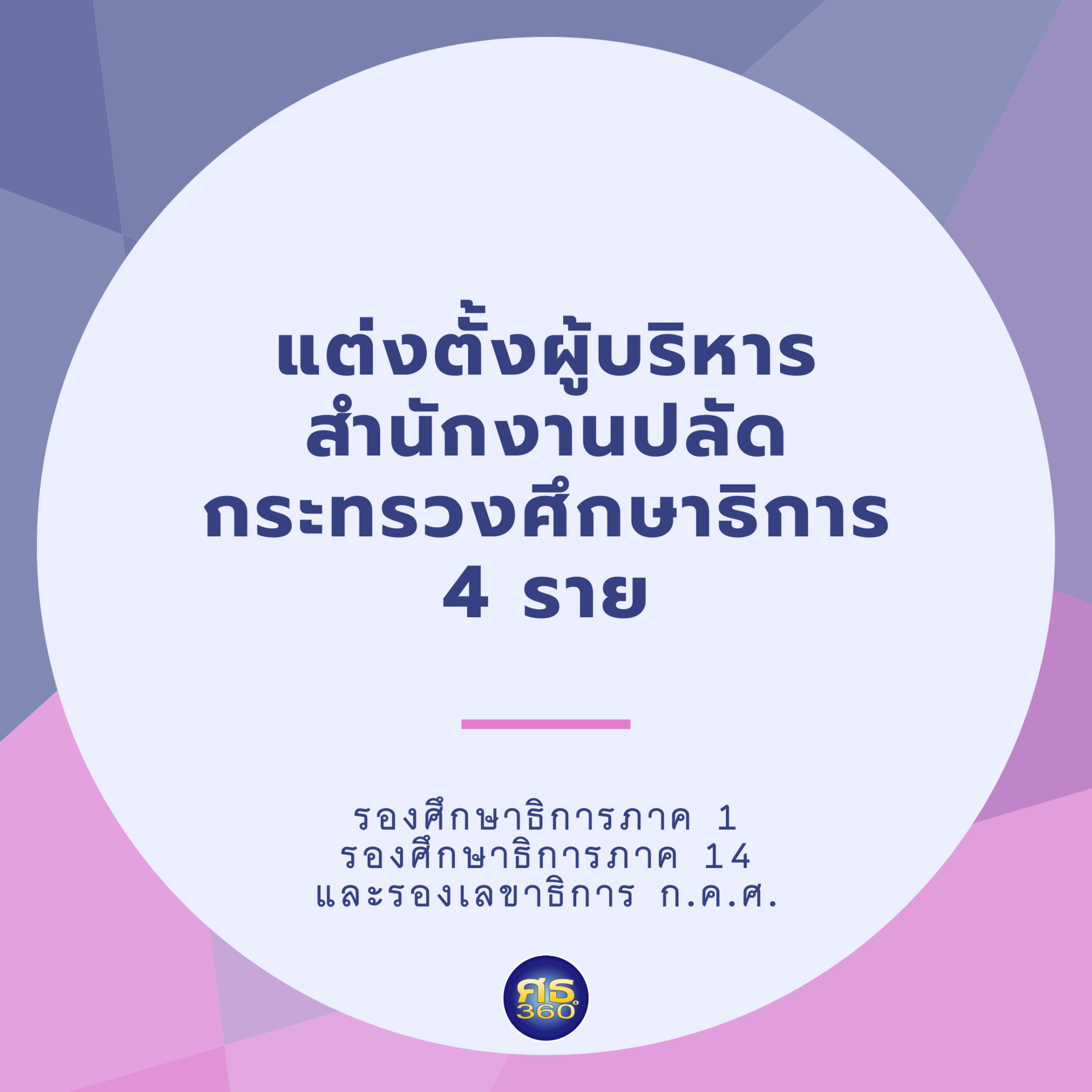 แต่งตั้งผู้บริหาร สป.ศธ. 4 ราย สำนักงานปลัดกระทรวงศึกษาธิการ มีคำสั่งแต่งตั้งผู้บริหาร 4 ราย นายทวีสิทธิ์ ใจห้าวผู้อำนวยการสำนักตรวจราชการและติดตามประเมินผล สป. ให้ดำรงตำแหน่งรองศึกษาธิการภาค 14 (อุบลราชธานี) นางสาวจิร...