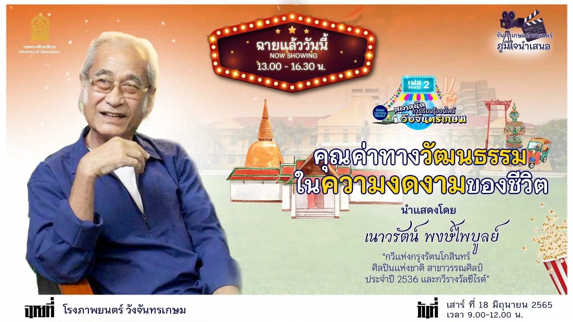 ตลาดนัดการเรียนรู้ออนไลน์วังจันทรเกษม เฟส 2 หลักสูตรสุดท้าย “คุณค่าทางวัฒนธรรม ในความงดงามของชีวิต” โดยเนาวรัตน์ พงษ์ไพบูลย์ กวีรางวัลซีไรต์ ศิลปินแห่งชาติ ชี้ ศธ.ต้องรับผิดชอบการรู้หนังสืออย่างเป็นรูปธรรม พร้อมเสนอคืนบท...